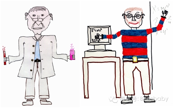 伊利诺斯州的七年级学生凯尔对科学工作者的印象:左边是之前“白大褂、眼镜、试管(里面貌似有毒的液体冒着泡,就快要溢出来)”;右边是拜访科学家之后的印象“彩色条纹衫、金色皮带”。