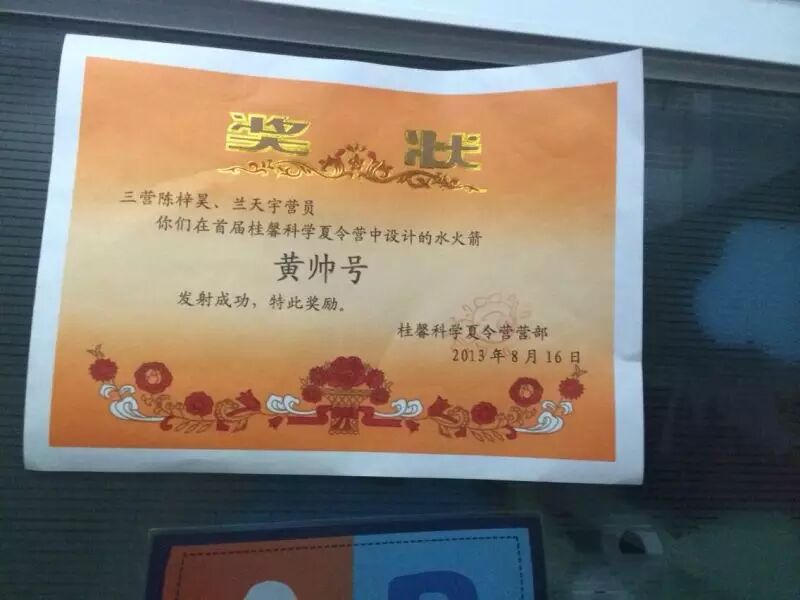 “胜哥,你知道吗?”他对我说:“我家的墙壁上还张贴着一张奖状呢!”没等我回答,他接着说:“祝贺兰天宇营员制作的‘黄帅号’水火箭顺利升空!”我和王彬惊诧于他的记性,我问他能不能用手机把照片拍下来发给我?他点点头,说,“行,还有营服。”