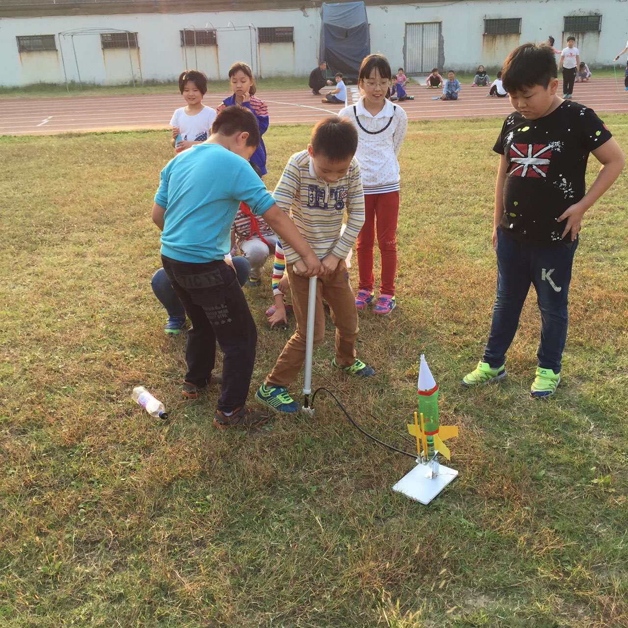 水火箭又称气压式喷水火箭、水推进火箭。是利用废弃的饮料瓶制作成动力舱、箭体、箭头、尾翼、降落伞。灌入一定数量的水,利用打 气筒充入空气到达一定的压力后发射。是利用水和空气的质量之比(水的密度是空气的816倍),压力空气把水从火箭尾部的喷嘴向下高速喷出,在反作用下,水火箭快速上升,加速度、惯性滑翔在空中飞行,像导弹一样有一个飞行轨迹,最后达到一定高度,在空中打开降落伞徐徐降落的火箭模型。
