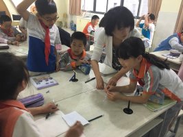 虽然今天杭州的天气较沉闷,但景苑小学的教研活动氛围热闹非凡!李霞特师在百忙中抽空在上午一二两节指导了黄梦瑶和王慧两位老师的课,黄老师执教《生活中的静电现象》,她首先让学生谈谈生活中自己认为静电现象的例子,在给学生提供塑料管和纸自己来做摩擦起电的实验(有的做成功,有的则没有),意在认识摩擦可起静电。接着做一个塑料管放在底座上,另一个在任何地方摩擦,然后靠近没摩擦过塑料管一端,看有什么现象(相互吸引)。再做两根都摩擦后,在靠近,又会出现什么现象(相互排斥)。又用ppt呈现生活中静电现象随处可见,让学生思考为什么物体不带电?(一个物体正负电荷相等的)ppt视频呈现资料来学习(电荷有正负,摩擦使电荷移动产生静电现象等)。李特由于有事稍做一点建议:让老师大胆处理教材,让学生明白一个问题即可,静电现象是什么,它的特点、无处不在(广泛存在)、产生原因以及材料的设计与处理。王慧老师执教《认识小灯泡》,先让学生在纸上画一画自己头脑中的小灯泡,两位学生上台画,再评比画的小灯泡。接着观察手中小灯泡,对比认识小灯泡外部结构。又认识小灯泡内部结构:先猜测,再实验验证——解剖小灯泡,观察它的内部结构,再补画完整小灯泡。灯泡亮起来,还需要哪些材料及安全用电知识教育。李特对这节课给予表扬——对小灯泡认识充分。