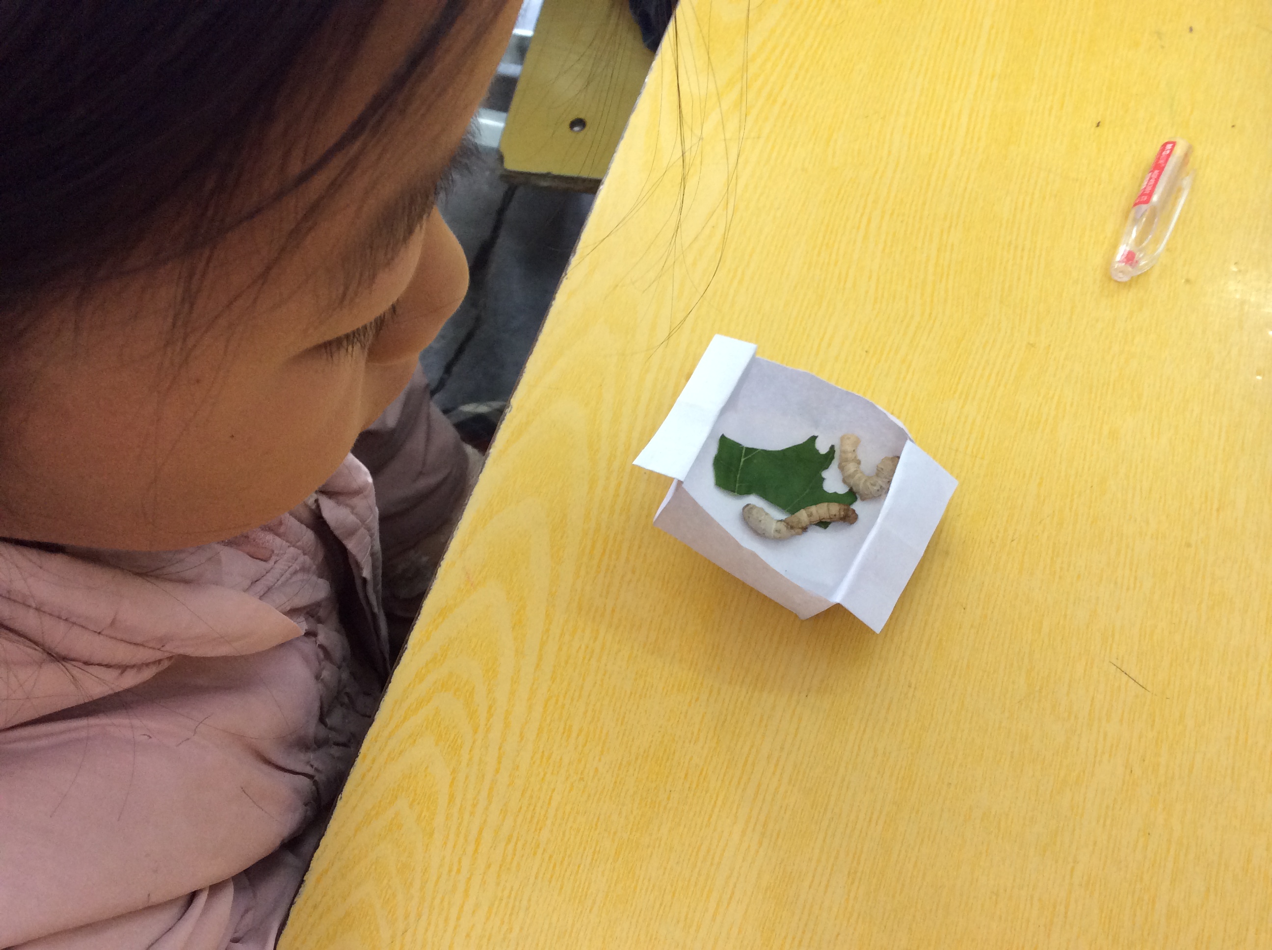 蚕宝宝正在蜕皮,小同学静静的看着,怕影响蚕宝宝蜕皮哦!