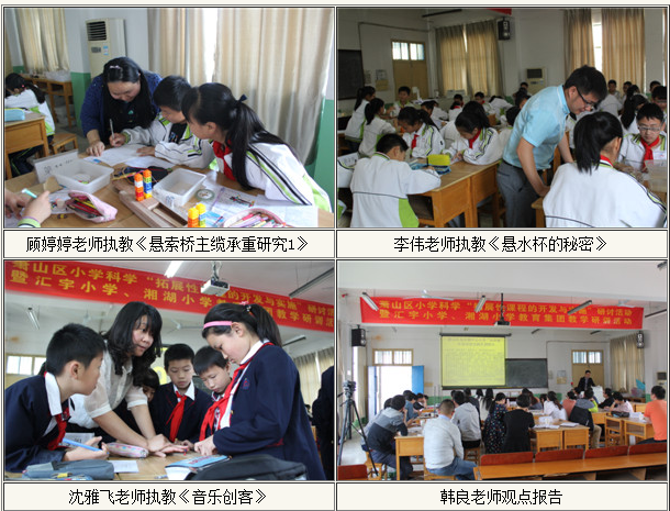 上午的活动是由南翔小学科学团队进行的拓展性课程展示。 第一节课是顾婷婷老师执教的《悬索桥主缆承重拉力研究1》,顾老师通过课前搭模型、读信识结构、改桥测承重、思桥理规律,带领603班的同学学习了有关桥梁力学的知识,孩子们初步明白桥梁力学并不简单。第二节课是李伟老师执教的《悬水杯的秘密》,李老师通过悬水表演吸引601班学生的眼球,围绕学生提出两个问题:为什么悬水杯的水不流下来?为什么我们可以控制水流不流下来?让学生自己尝试悬水,针对悬水现象进行原因分析,根据假设设计方案并动手探究解密悬水杯的科学原理。第三节课是沈雅飞老师执教的《音乐创客》,沈老师通过近一年孩子们的创客前期展示,音乐创客的科学原理回顾,在课堂上再次以抽签决定每组的创客内容,404班的孩子们通过20分钟的设计、制作、排练、演奏。最后为全班以及全体听课老师展现了自己的风采,运用iPad进行现场投票,评出了最佳设计、最佳演奏、最佳乐器、最佳音效奖。让听课老师印象深刻。