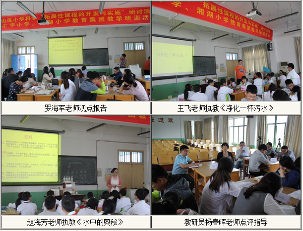 下午的活动是由益农镇小科学团队带来的拓展性课程展示。首先由韩良老师对金沙地环保主题的拓展进行了介绍。然后是由罗海军老师拓展性课程介绍,罗老师紧紧抓住孩子们爱玩、好观察的特点,精心设计了非常有趣“水”课程、“走马灯”课程、“植物养植”课程。让听课老师受益匪浅,拓宽了我们课程开发的思路。下午第一节是由王飞老师执教的《净化一杯污水》,王老师风趣幽默,从“猪坚强”引入,说明水的重要性。通过让602班的孩子们自己研究粗砂、细沙、PP棉、脱脂棉、活性炭等滤芯材料,设计净化滤芯的放置顺序,最后根据过滤效果,解析各种滤芯的特质,再次进行过滤,课堂气氛活跃。第二节是由赵海芳老师执教的《水中的奥秘》,赵老师通过上节课孩子们自己净化的污水进行水质监测,讲授显色这种监测水样的方法。准备了四瓶不同水质的水,让孩子们通过显色来进行水质PH值及余氯检测,并对孩子们如何健康喝水进行指导,极富生活性。