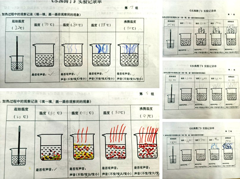 学生参与教学的思维过程是不可视的,我们平时教学中,只能靠课堂师生对话来引导学生的思考方式和方法。学生完成报告单一、二的过程,就是经历了观察整个水沸腾的过程。这个过程中,孩子经历了猜测、观察、实验、研讨等活动,这个过程,也是孩子发现事实、
