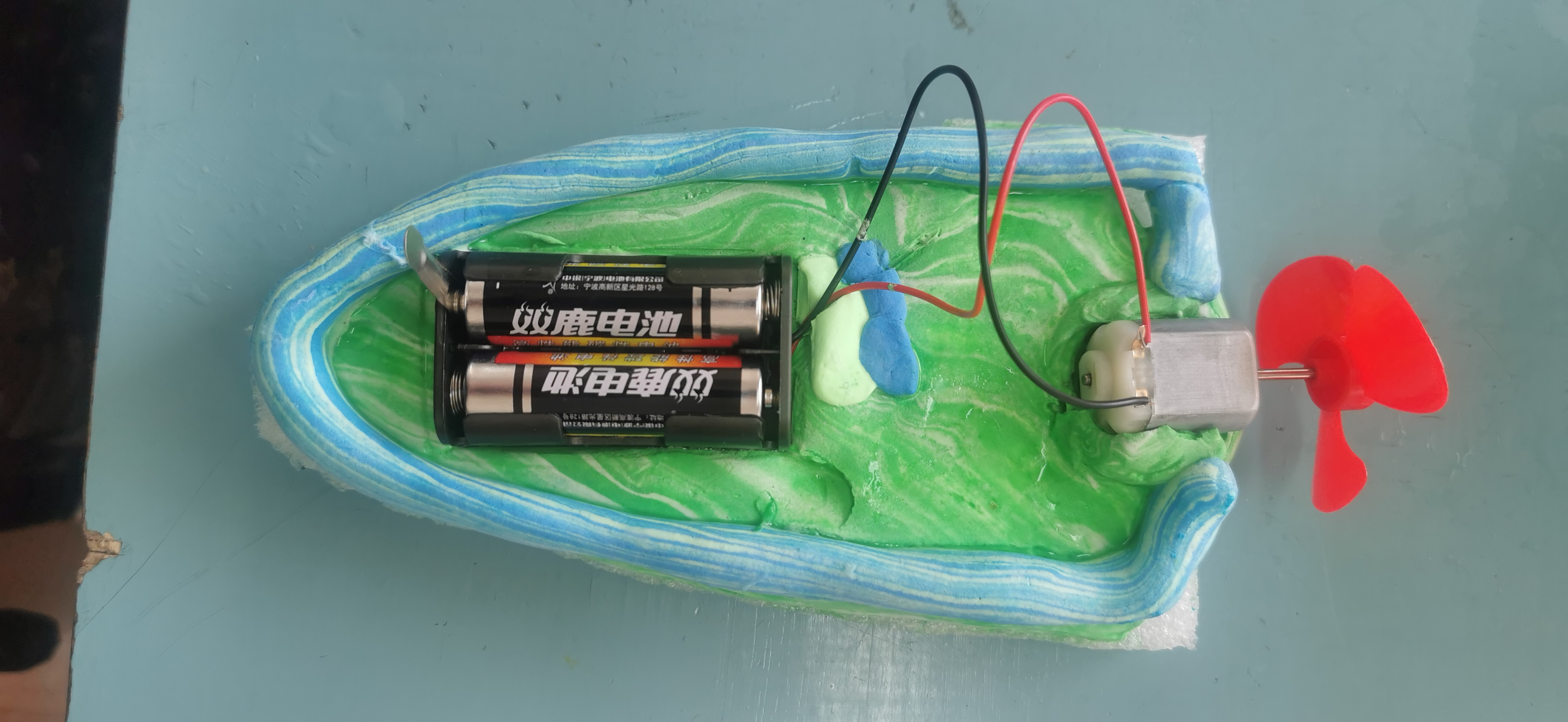 这艘小船做得也非常精致,船上的栏杆,和船上的救生圈都用家里的电线丝做的,同学还考虑到了电池容易湿,用塑料盒子罩住了,密封在了里面,船底还有船舵等等,特别棒。就是没考虑到载人或者载货物。(2022/4/18 21:48:43 上传)