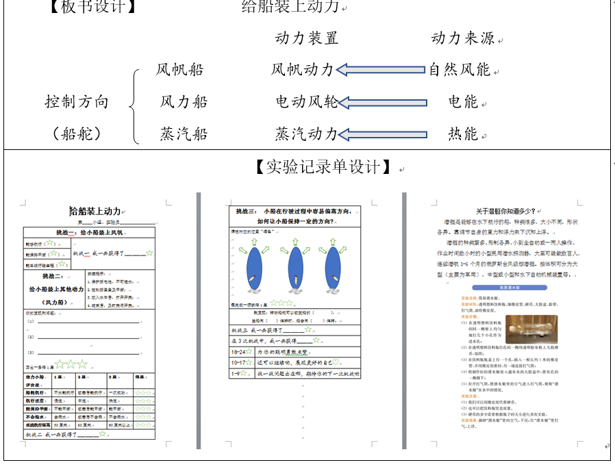 (2)交流:如果给小船安装电动风轮或蒸汽装置,需要哪些材料?如何安装?记录在记录单中。