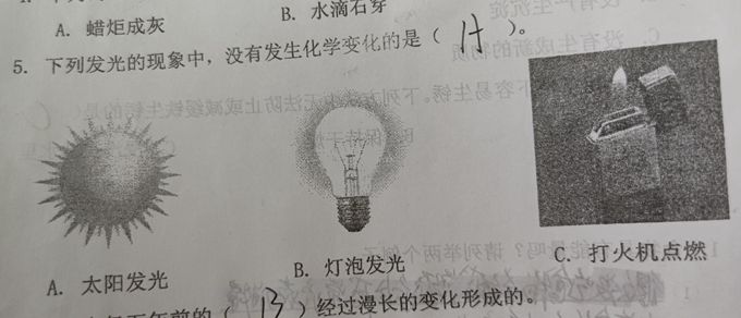 灯泡发光,是因为钨在高温下发出白色的光。并没有和灯泡内的气体发生化学反应。太阳发光发热是内部核聚变的结果,是原子核的变化,不属于化学变化的范畴。化学变化是核外电子的转移。