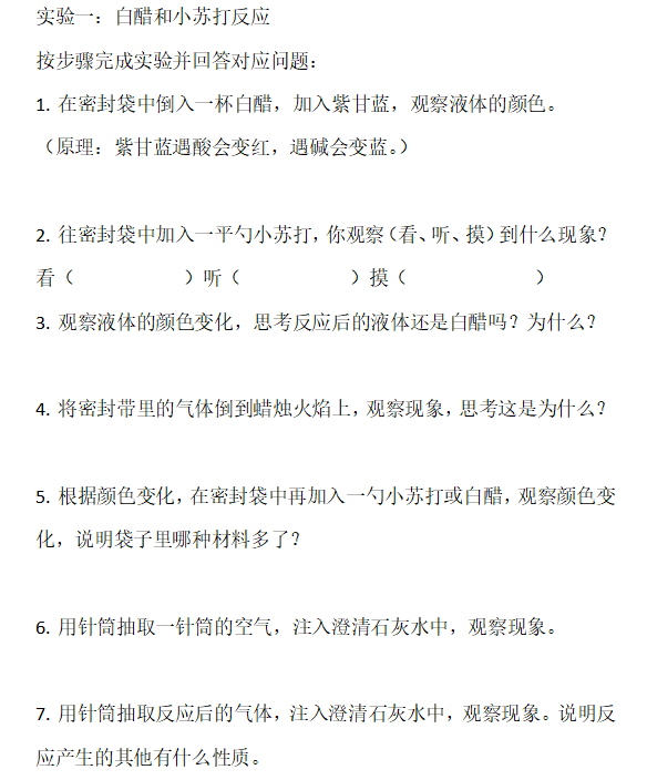 想通过实验的方法来进行复习,就要先抓住本单元的重点以及难点。本单元的重点主要就是白醋和小苏打,蜡烛燃烧,加热白糖以及紫甘蓝变色这四个化学变化伴随的现象和产生的新物质,如何证明产生了新物质。为了让不能能力水平的学生都能在这个实验中有所收获,我将书本上原来的实验进行了改进处理。