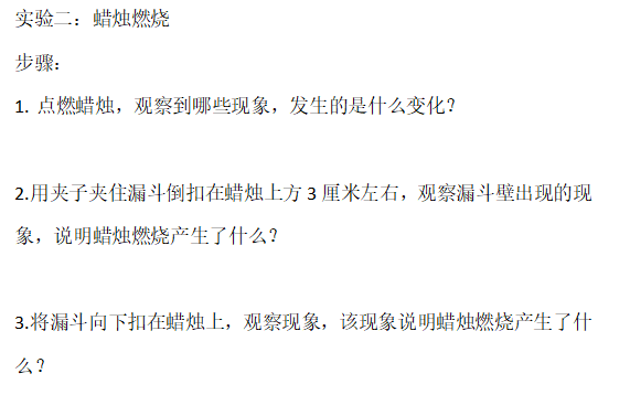 蜡烛燃烧实验,我同样采用寻找证据的方法,让学生尝试利用实验现象解释原因,我采用蜡烛上方倒扣一个漏斗的方法,由于实验课的时候比较热,很多小组漏斗边缘没有水珠出现,这时就有聪明的同学发现管子里面有水珠,这也能证明蜡烛燃烧产生了水。通过把漏斗倒扣在蜡烛上,蜡烛马上熄灭,也证明了产生了不支持燃烧的物质,这种物质比空气重等