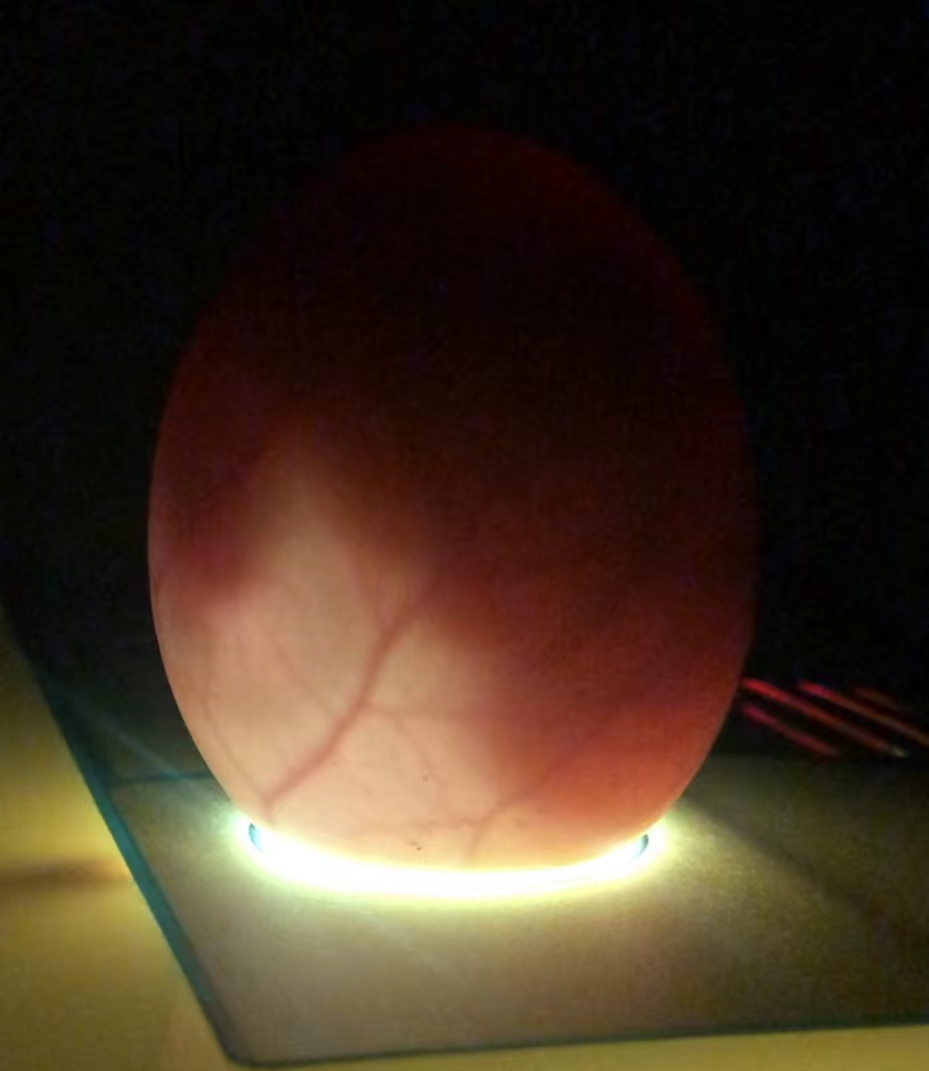 7.16已孵化6天,紧张而又兴奋地打开手电筒照蛋,结果1枚有网丝,受精成功,继续孵化;另一枚没有网丝,受精失败