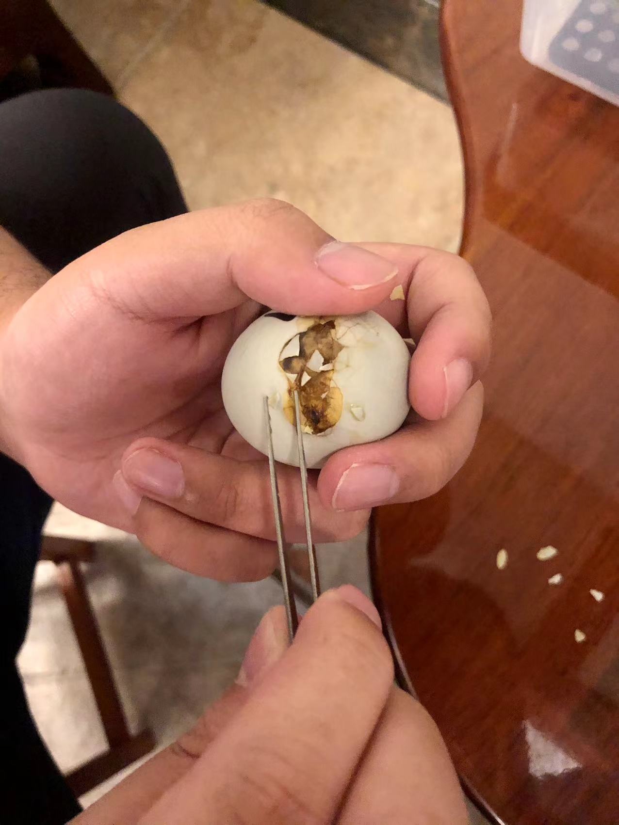 8.5下午开孔,开孔前喷水,用镊子小心翼翼的把起嘴附近的蛋壳夹开,位置很好,很顺利的找到了嘴巴和鼻子,让嘴巴和鼻子露出来,防止憋着了,这个过程可以用“激动的心颤抖的手”来形容!开孔后,放会孵化器中继续孵化,期待它的破壳而出