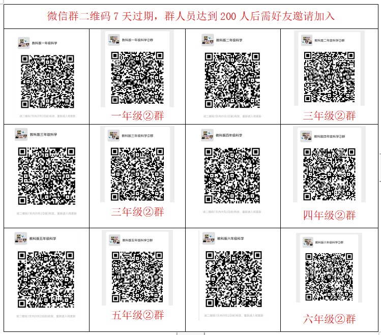 为了方便老师交流,延续分版本、分年级的管理策略,本学年我们针对教育科学出版社(简称教科版)小学科学延用或创建了教科版小学科学QQ群、钉钉群和微信群,现将相关交流群的群号(二维码)予以公布,有需要的老师按要求加入,并请遵守交流群的管理要求。