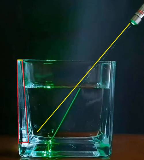 3.思考点:容器1笔头往上折射,容器2光束和向下折射,这是为什么?