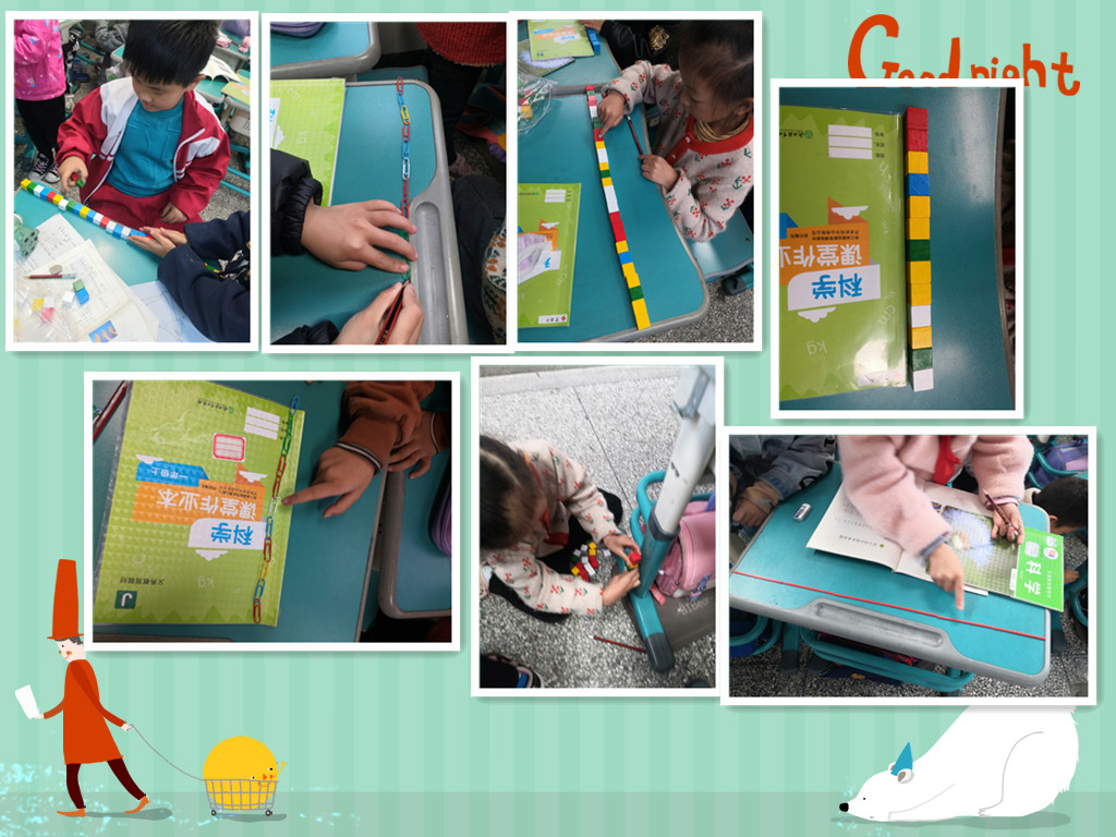 一年级第二单元第6课,做一个测量纸带活动,学生需要在教师指导下,依照制作测量纸带的步骤进行制作,然后,利用自己制作的测量纸带测量一些物体的周长,运用十进制记录测量结果。总体而言,通过活动让学生体会工具的改进给人们测量带来的便利,认识到人们总是在解决问题中不断地完善和改进工具,从而增强了人的能力。这节课,没有多大的难点,但细节有不少需要关注,一、用固体胶粘还是用双面胶粘,通过比较一年级的学生比较喜欢用固体胶粘,所以课前要有准备,因为教具箱中没有固体胶,只有双面胶,建议教具箱能改进一下。二、剪刀。教具箱中有12把,事实上还不能满足本节课的要求,至少2人一把,最好是一人一把,这样能够按时完成测量内容,否则不能完成制作、测量活动。三,测量物提供。测量小筒个人觉得不方便,我让学生测量200ML塑料量杯,小筒上下端数据有较大差别,容易让学生怀疑测量结果,而统一的闻量杯,数据相差不会太大,容易让学生发现自己测量条的问题。