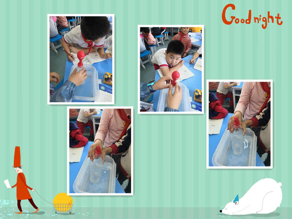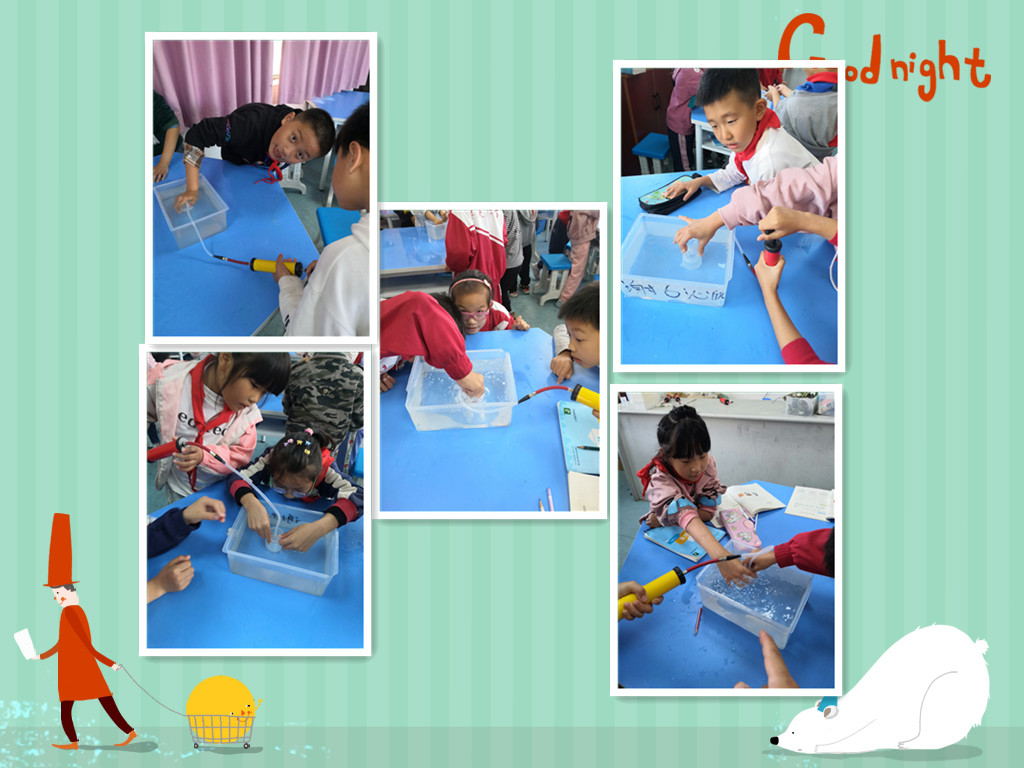 (预设:(1)说:水里看见气泡,水面上看见白色的气体等;(2)用画图的形式。)
