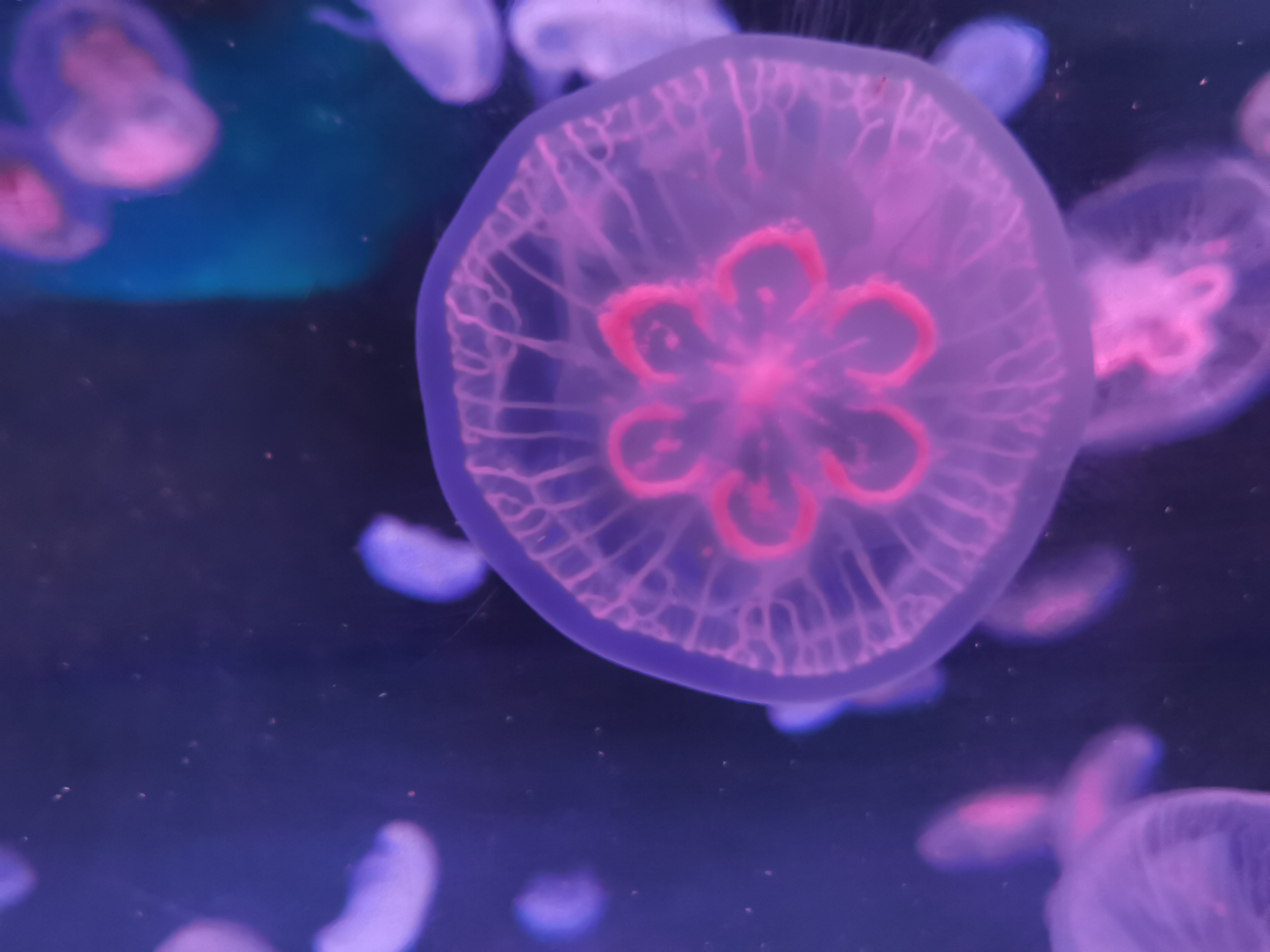 去海洋馆去了4次,这次有了新的发现。海洋馆中有个水母馆,一般看到的海月水母都是图一的状态,白白的透透的。这次刚好碰到饲养员在喂饲料,一些很细小的饲料从滴管挤到水中,水母捕食了一会后就变图二的样子,过了半个多小时后就变成图三的样子。回去了解了一下,这个花瓣状的部分是水母的胃囊,一根根触手是口腕,口腕将食物捕获送入胃囊中。
