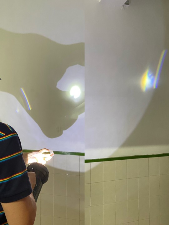 然后进行调整,选择在走廊上用强光手电筒照射,呈现在白墙上,效果还不错,通过不断转换棱镜的角度,就能出现比较好的实验现象。