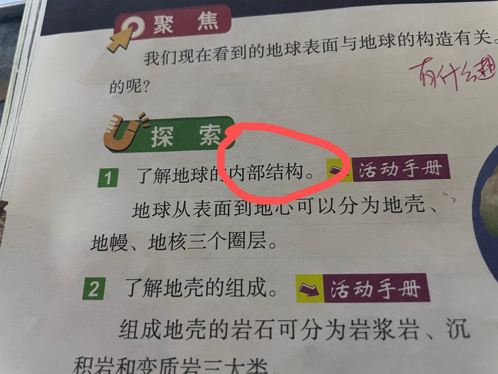 探讨的主题是地球的构造,在提问的过程指向学生探索地球内部构造,学生通过资料和图示了解到地球的构造是地壳、地幔和地核三部分。但最后探讨部分问题:地球内部的结构是怎样的时候?学生认为地壳是地球的外面包裹部分,因此基于他们的认知,会认为地壳不是地球的内部结构。导致后续学习中,板块运动、地震等地壳层面引起的地形变化是地球内部力量引起的,学生在这个概念建构有一定的障碍。