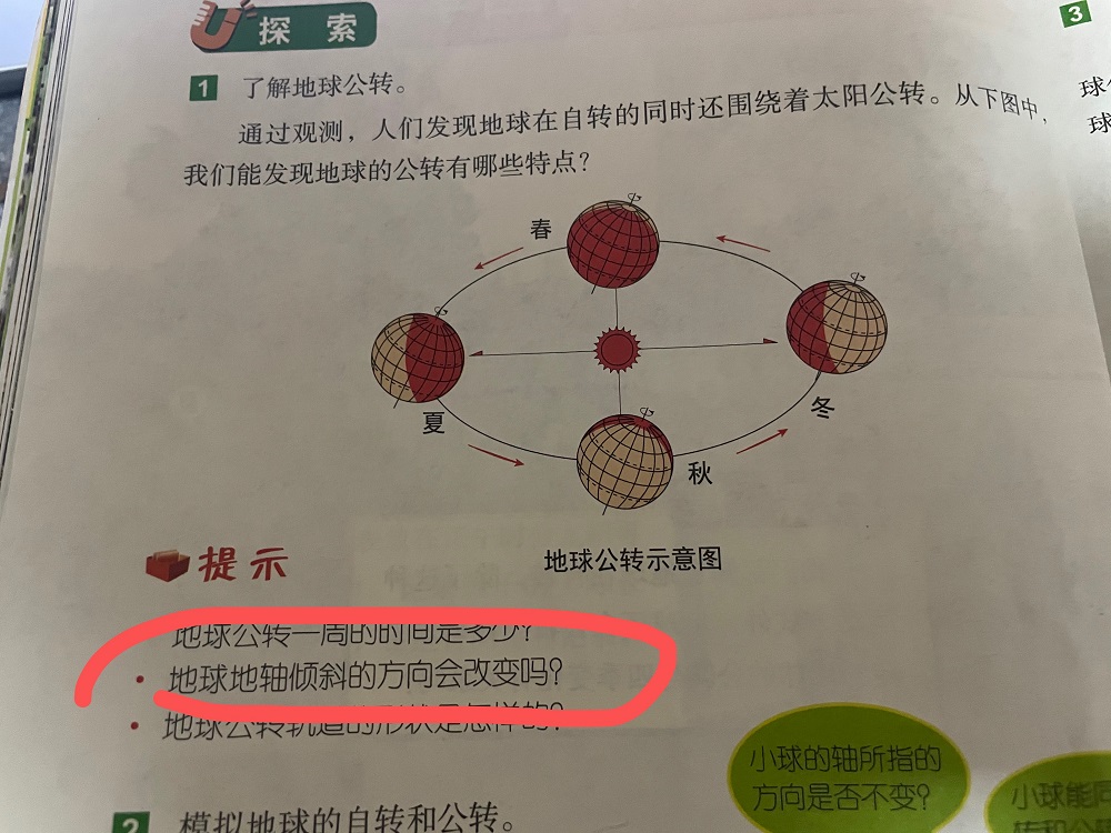 让学生观察地球公转示意图进而去发现地球公转的特点?提示部分有一个问题:地球地轴倾斜的方向会改变吗?部分学生会发现地球地轴倾斜的方向是不变的,但有一部分认为倾斜方向是变化的。根据与学生探讨的过程中发现部分学生认为地球从冬季位置逆时针公转到夏季位置,地轴倾斜的方向从太阳的右边到太阳的左边,因此认为地轴的位置变了当作是地轴倾斜的方向变了。