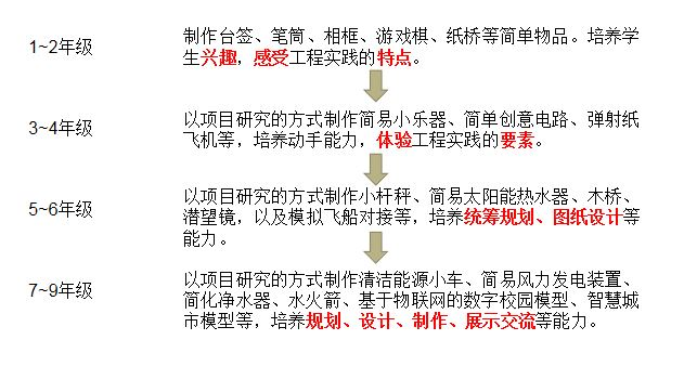 技术与工程实践活动要根据学生的知识经验和认知水平,设置既有科学性又有趣味性的学习内容;同时要根据学生的原有基础,有针对性地提出任务,着重在设计图纸、成本核算、测试评价及迭代改进方面进行实践,注意不同学段学习内容的衔接和进阶,使学生的工程实践能力螺旋上升。”
