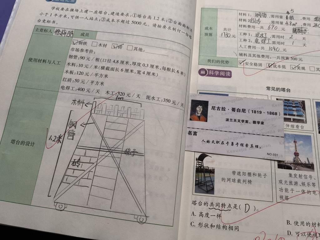 不管是出于设计层面,还是绘画技巧,孩子们的这些设计都略显青涩,毕竟五年级《船的研究》这一单元没有系统地学过,工程思维还没开发过,对于他们的作品应该给予更多的肯定,我就给一些态度好的同学附赠科学家卡片,希望能保持他们持续研究的动力!