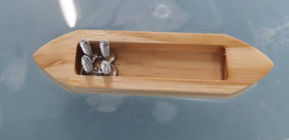 先找小钩码来测试,一个小钩码放在一端,已经侧翻;两个小钩码均匀摆放,已经稳稳沉入水中。看来小钩码不合适。