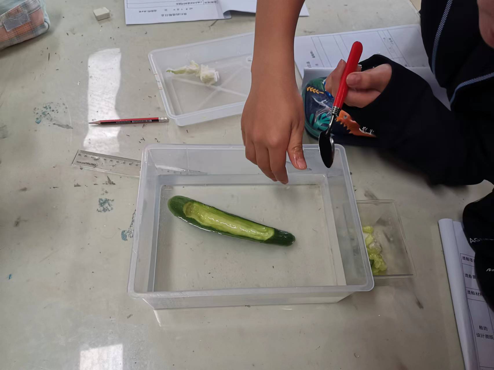 上课思路:回忆船的历史→明确研究独木舟,独木舟怎么制作→利用小黄瓜设计独木舟模型→制作独木舟模型→测试→小组分享设计图和独木舟模型→独木舟的优缺点→独木舟行驶时遇到阻力怎么办,影响船在水中阻力的因素