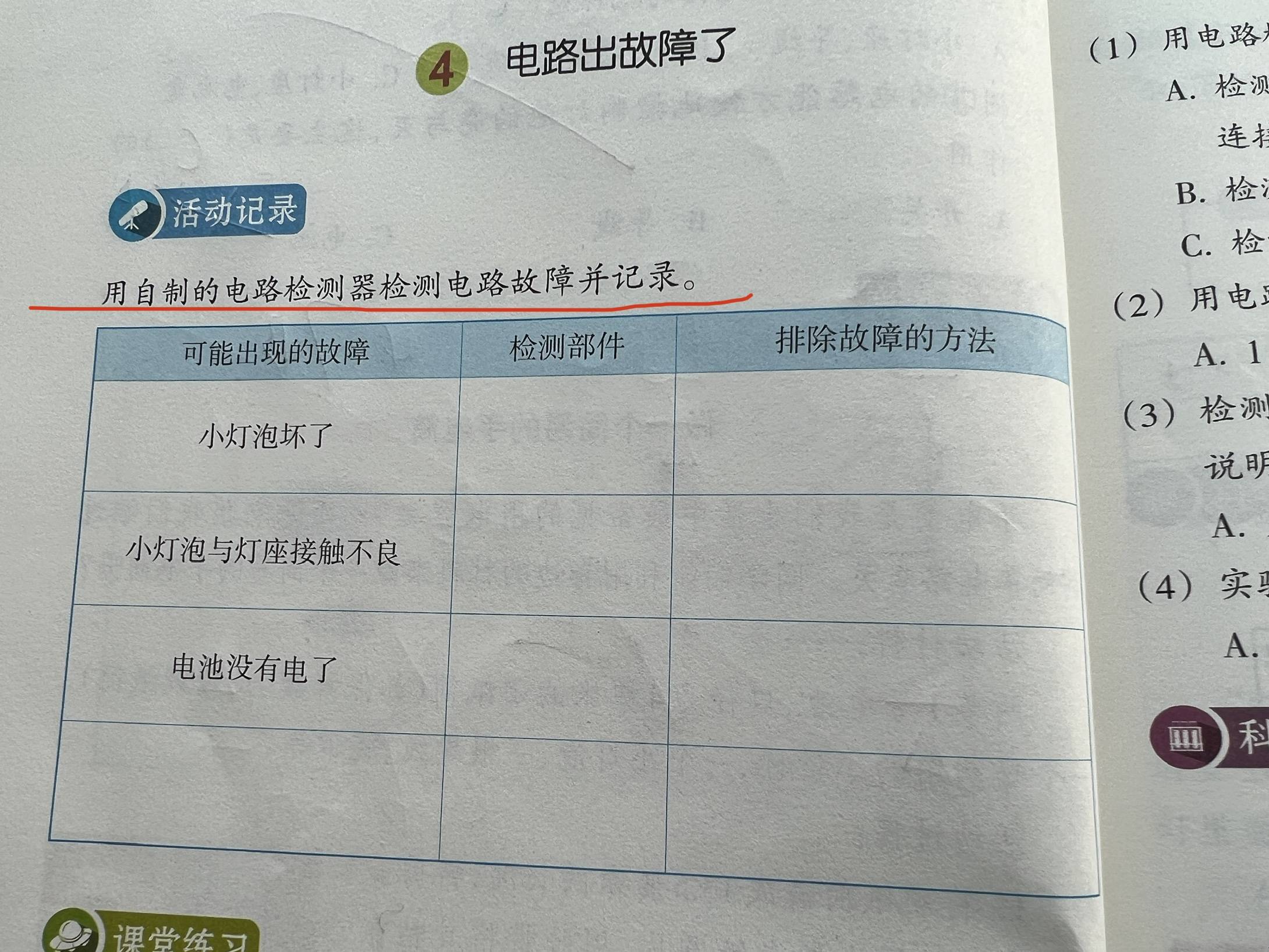 4.4《电路出故障了》--------用教材活动记录表层层推进电路故障检测法。
