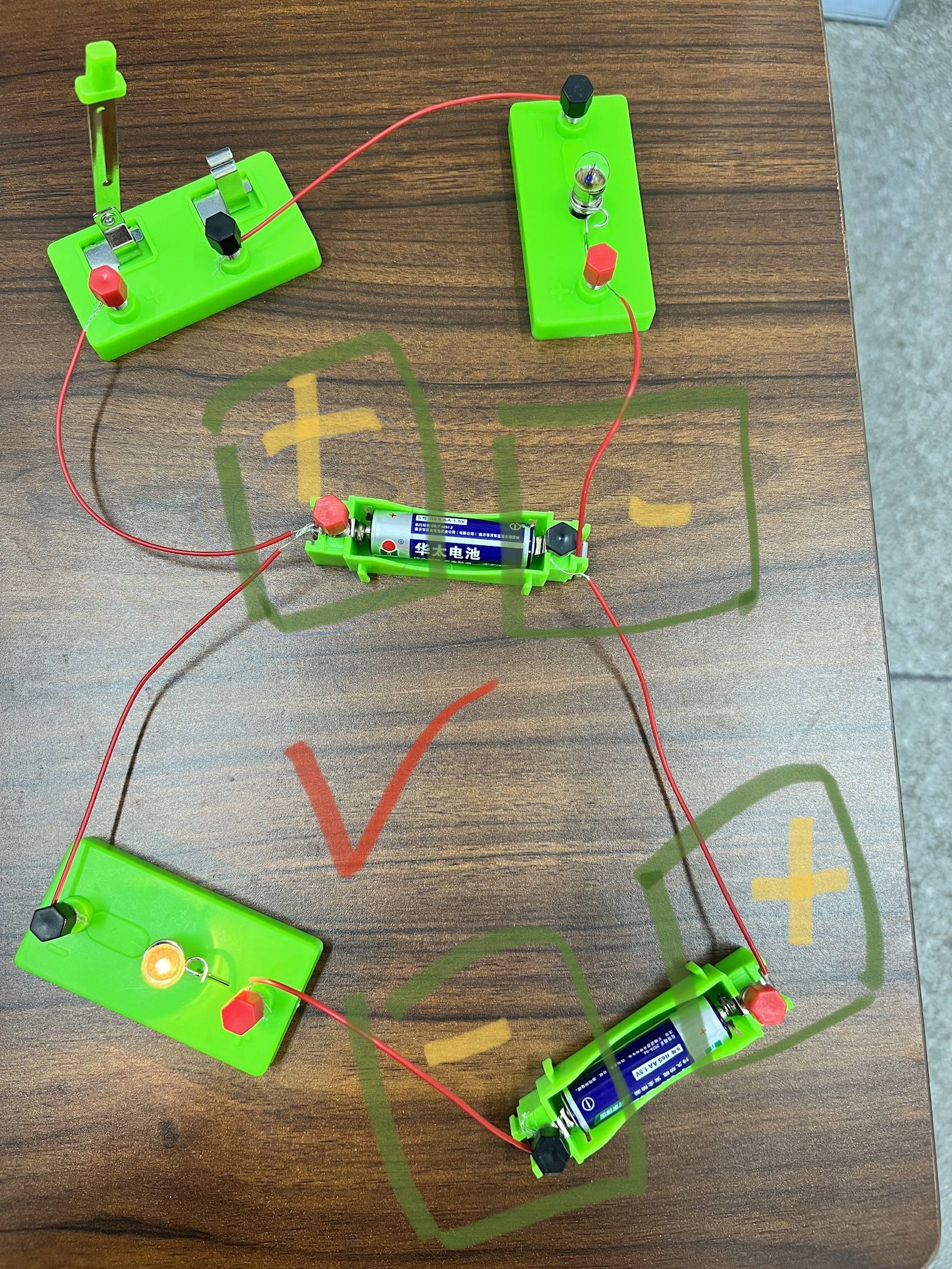 重新检查连接后的电路,闭合开关,小灯泡依然不亮。这时候学生们有些困惑。但也有同学提出是灯泡和灯座接触不良,并自告奋勇上来检查。在他翻来覆去检查灯座背面时不小心压了一下灯泡,灯泡亮了。于是他发现是灯泡底部和灯座处的接触不良,一举解决了故障问题。