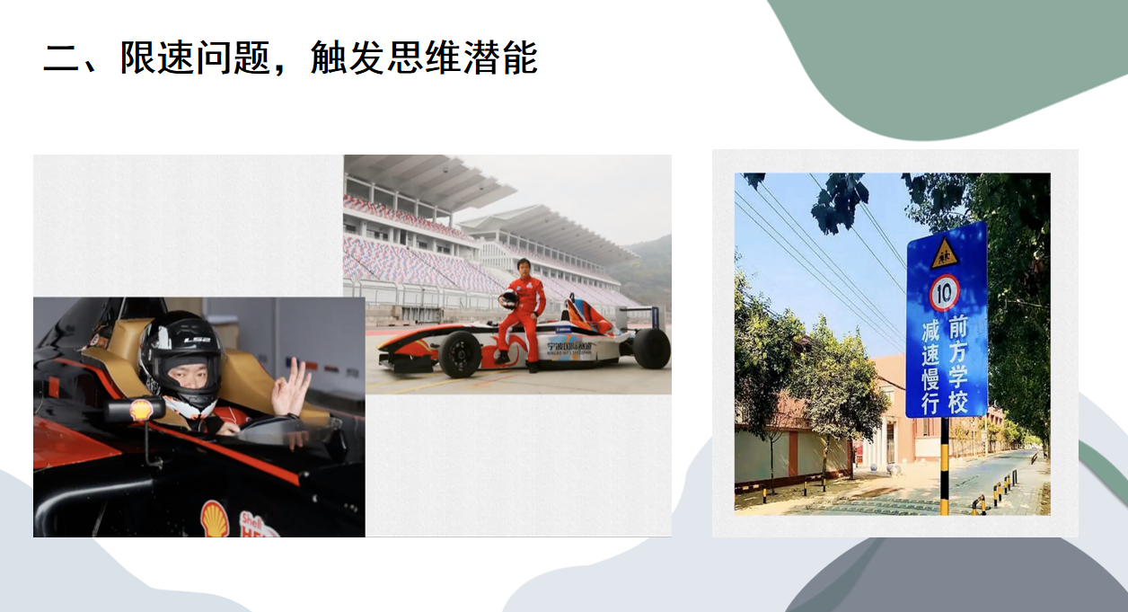 第一组对比图。风驰电掣的赛车与校门口的限速,一下子让学生发现探究的问题。