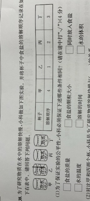 题目中没有明确从哪个角度出发进行研究,但是从图推测是从搅拌情况、温度探究,但是丙和丁是否也要从颗粒大小进行考虑
