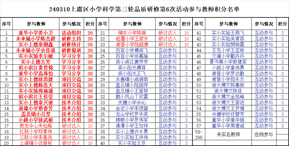 2.每月研修积分:积极参与小学科学网每月研修活动,参与1次得3分,每次参与中网络互动10次以上得10分;撰写心得体会得20分。