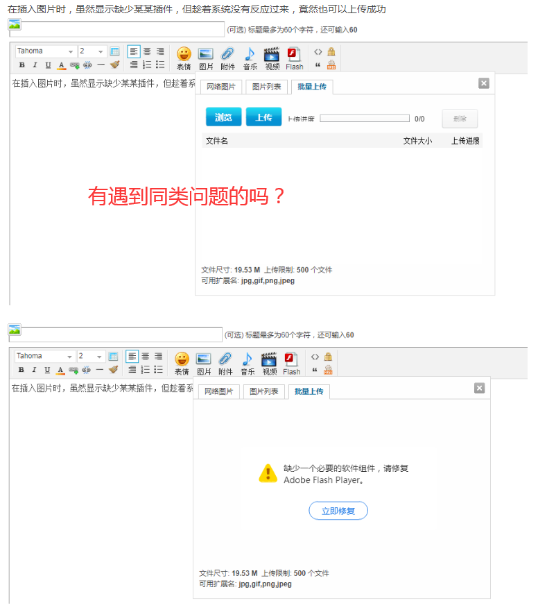 在插入图片时,虽然显示缺少某某插件,但趁着系统没有反应过来,竟然也可以上传成功
