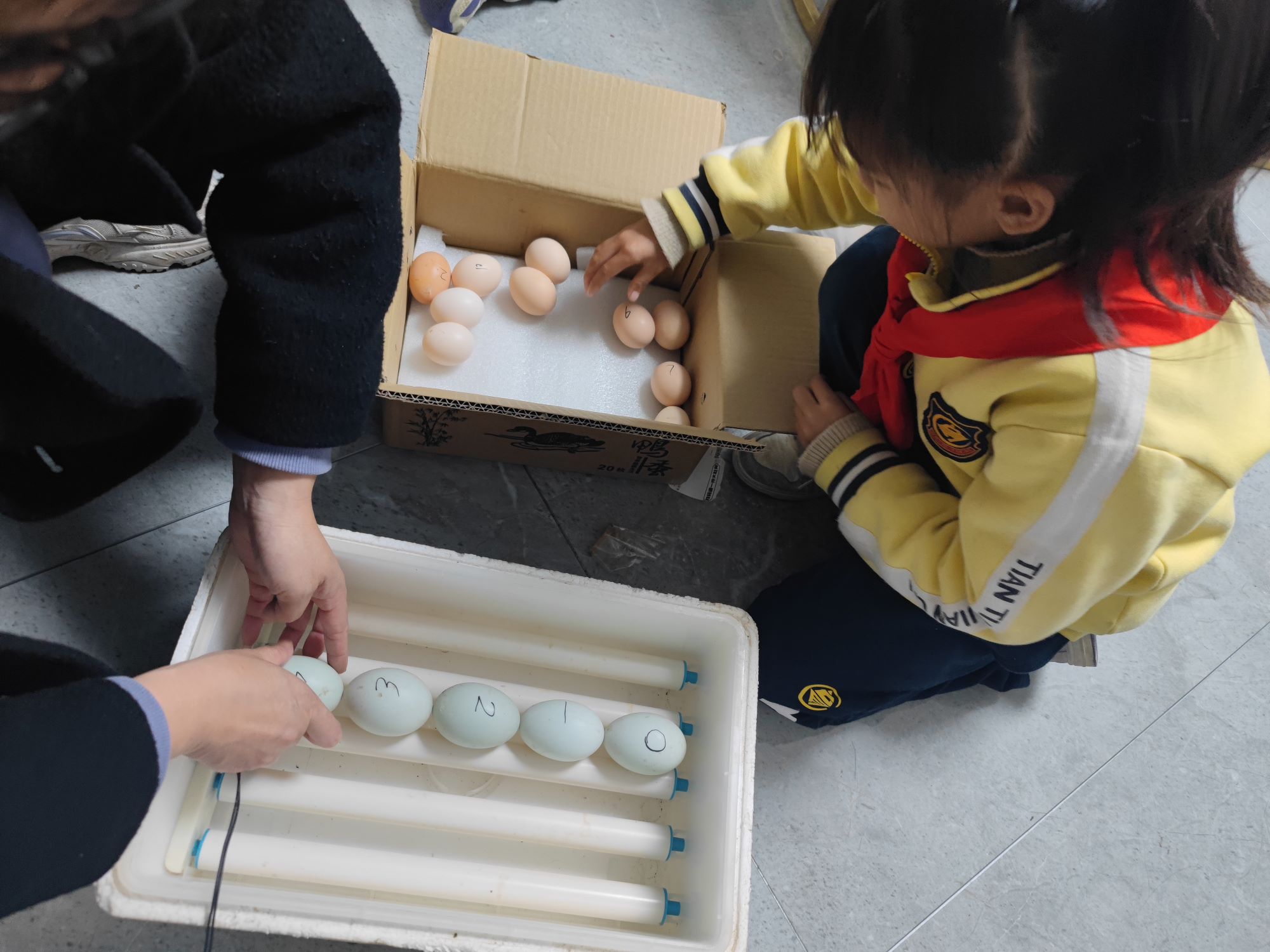 然后,两个娃都非常兴奋,等待小鸡、小鸭出世。老婆也是每天打开盒子看一下,翻一翻蛋!