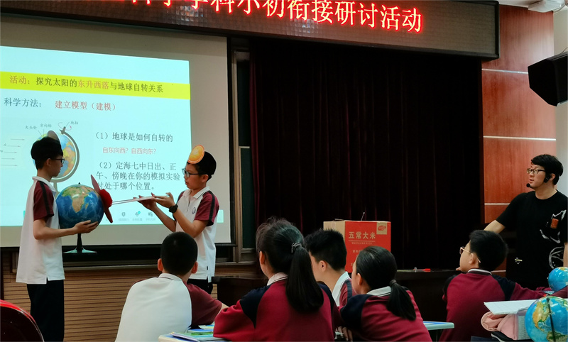 本次活动的展示课例挑选了初中教材《地球的自转》小学教材《昼夜交替现象》为例,共研中小学科学的衔接融合教学。这两节课的学习内容由浅入深,学习活动从简单到综合,小学和初中两个不同学段的教学活动在螺旋上升的教学目标和教学内容中得到有机结合,充分体现了本次活动的主题,让学生在探究实践中衔接科学观念、培养科学思维,帮助教师们拓展了小初衔接的思路与举措。