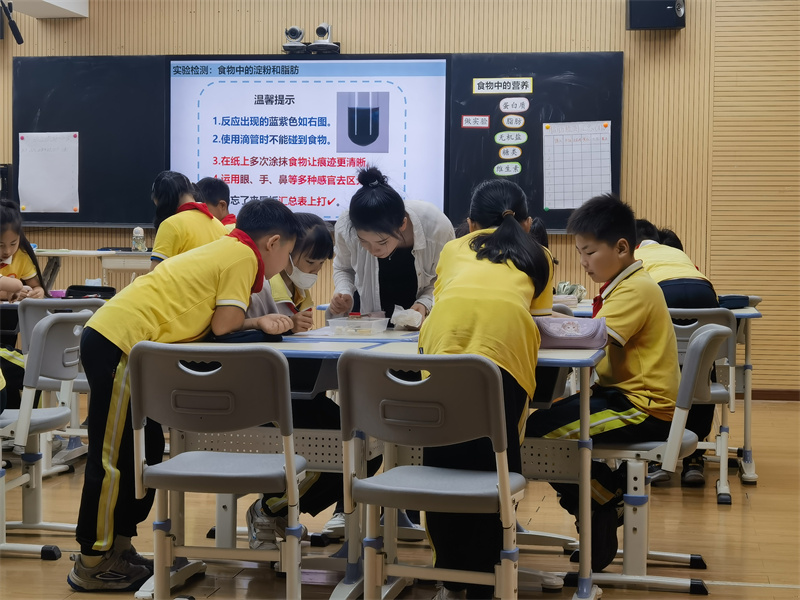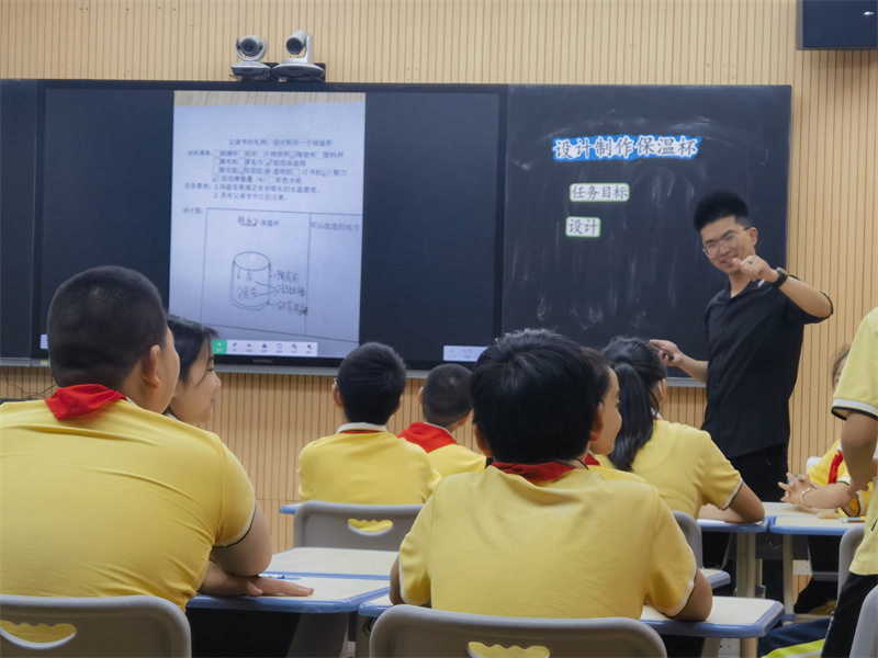 在骨干教师的前期指导下,双峰新城学校夏佳蓊和敬业小学柴锋磊两位青年教师分别展示了四年级《食物中的营养》和五年级《设计制作保温杯》两节课例。夏老师在《食物中的营养》一课中,创设“选聘学校食堂营养监督员”的情境任务,引导学生共同研讨制定营养监督员的选聘标准,并巧妙设计任务链,引导学生做实验、查资料来分析辨别食物中的营养,培养学生的实证意识和健康生活理念。最后,以X小学食堂意见簿的三项焦点问题:选择合适的牛奶、辨别淀粉肠、改良一日食谱测评学生的学习达成情况,同时也促进学生综合运用知识解决生活中的问题,达到学以致用的效果。柴老师在《设计制作保温杯》教学中以项目化学习理念重构教学内容,创设了“设计制作父亲节定制保温杯”的驱动性任务,根据课前问卷调查了解的爸爸们的喝水习惯,明确了保温杯的设计要求,并按热水组、温水组和冰水组让学生自主形成设计小组,依次进行设计、制作、测试、展评与改进。在项目实践中学生不仅发展了设计思维,还在测试与改进中发现了影响保温杯的保温效果的相关因素。