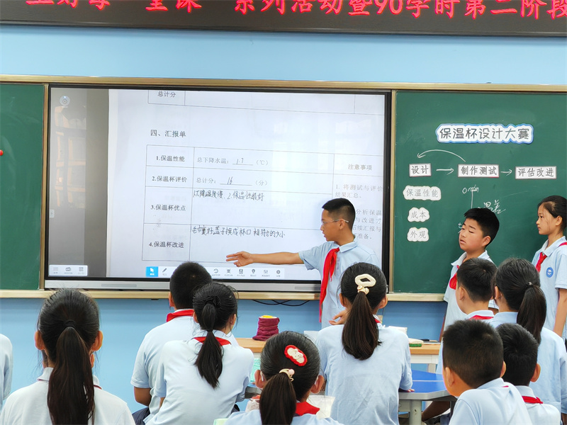 中旭科创学校的吴俊虹老师基于项目化教学中“设计思维”的运用研究执教了五下《保温杯设计大赛》一课。该课为五下《热》单元的拓展课,课程采用项目化设计,从消费者和生产商家的角度出发,以实际问题为驱动,引导学生依据本单元知识点进行开放性设计制作并进行评价,旨在通过设计制作保温杯的活动,巩固保温原理并切身体会科技发展的历程,从而使学生理解科技的发展能使人们的生活更加便利。