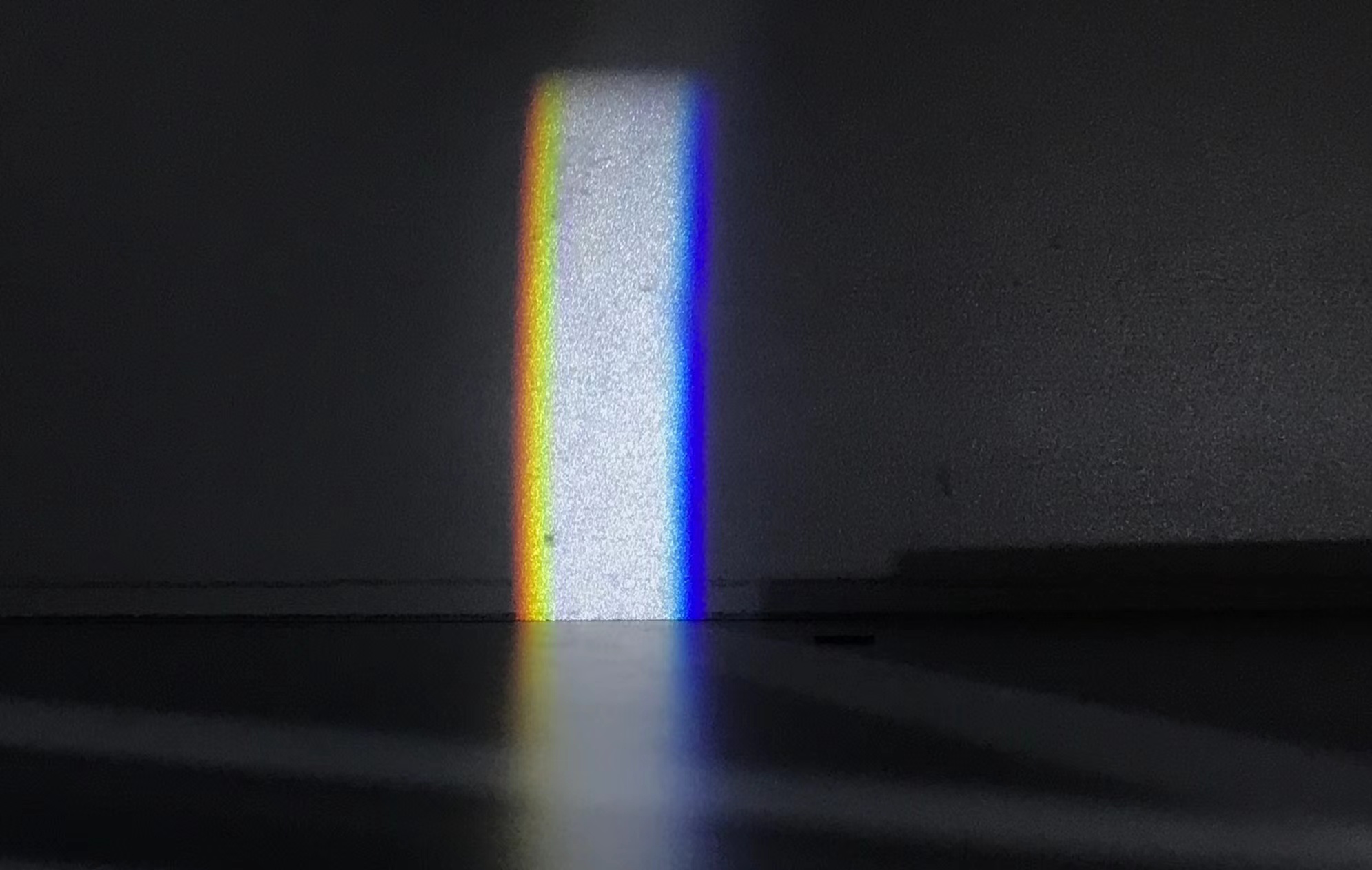 我上课的时候,让孩子们用白墙做光屏,这里的孩子们竟然能用各种物体做光屏,衣服,白纸,地面,桌面等等。这个实验关键用白光手电筒,照射的角度很重要。实验很容易成功,也很有成就感的。让孩子能兴奋的发现这个色散现象。