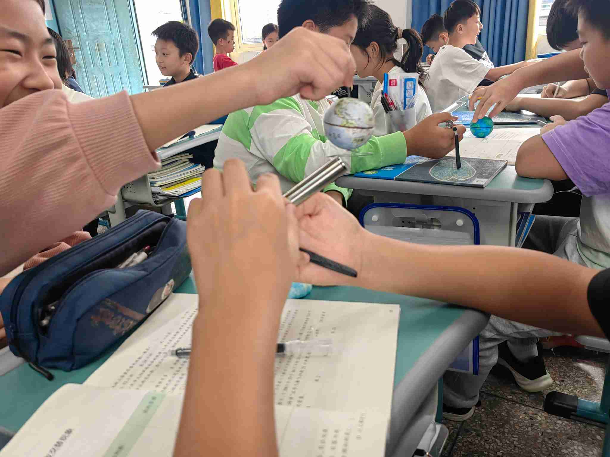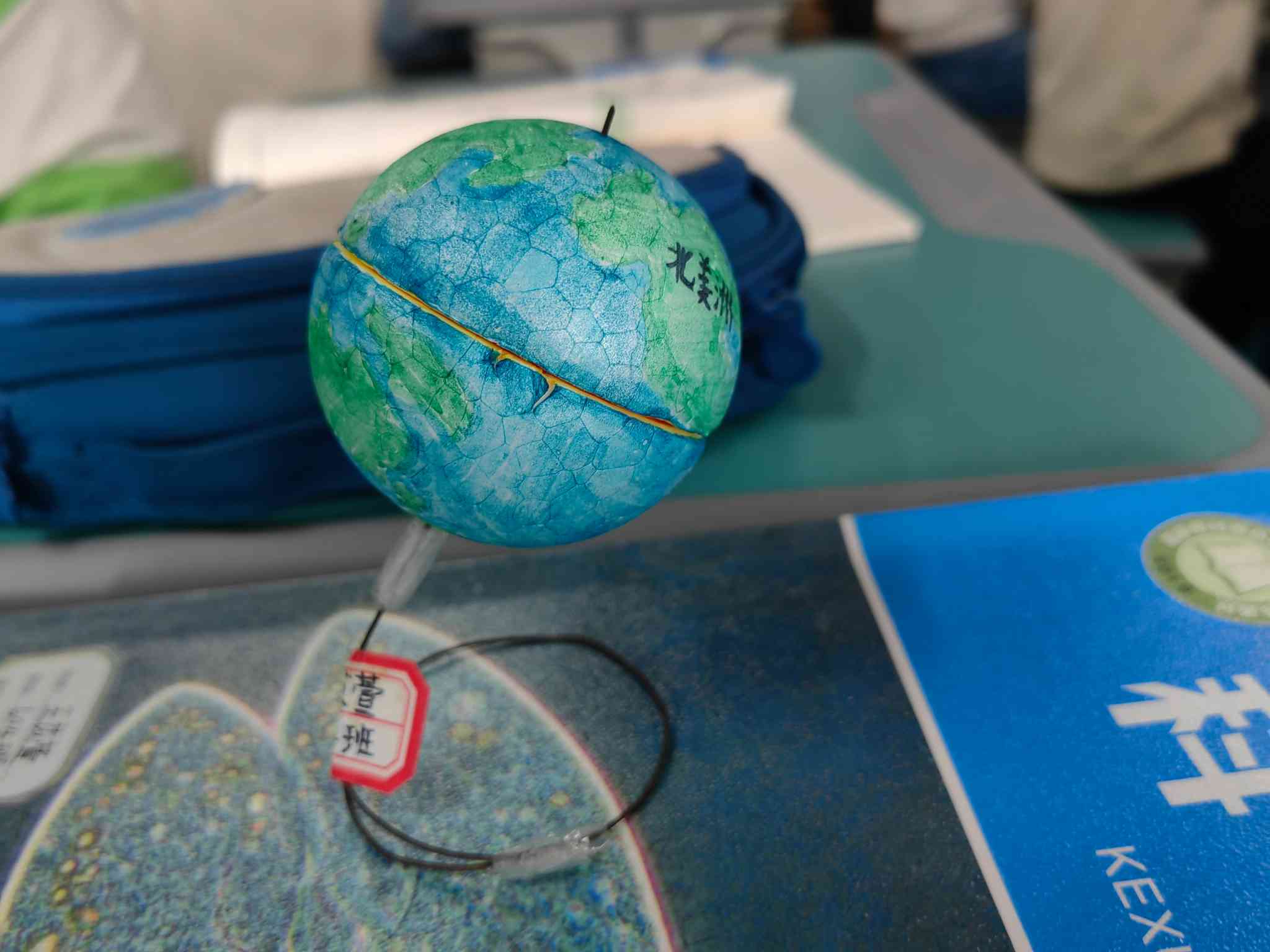 六年级《地球的运动》单元起始课上,发给每个学生两个直径6cm的泡沫半球,引导学生在剖面上完成内部结构模型,然后用细铁丝串成一个球,继续完成海陆分布模型和地球自转模型。而且这个模型在后续《谁先迎来黎明》、《昼夜交替现象》以及《地球的公转与四季变化》几课都可以结合地球仪一起使用。这几个是当时在某个班上课时拍的。