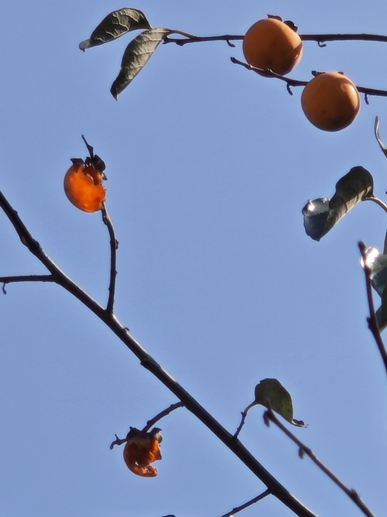 最初只注意到这颗柿子的颜色特别鲜艳,放大一看,好家伙,中间被吃空了