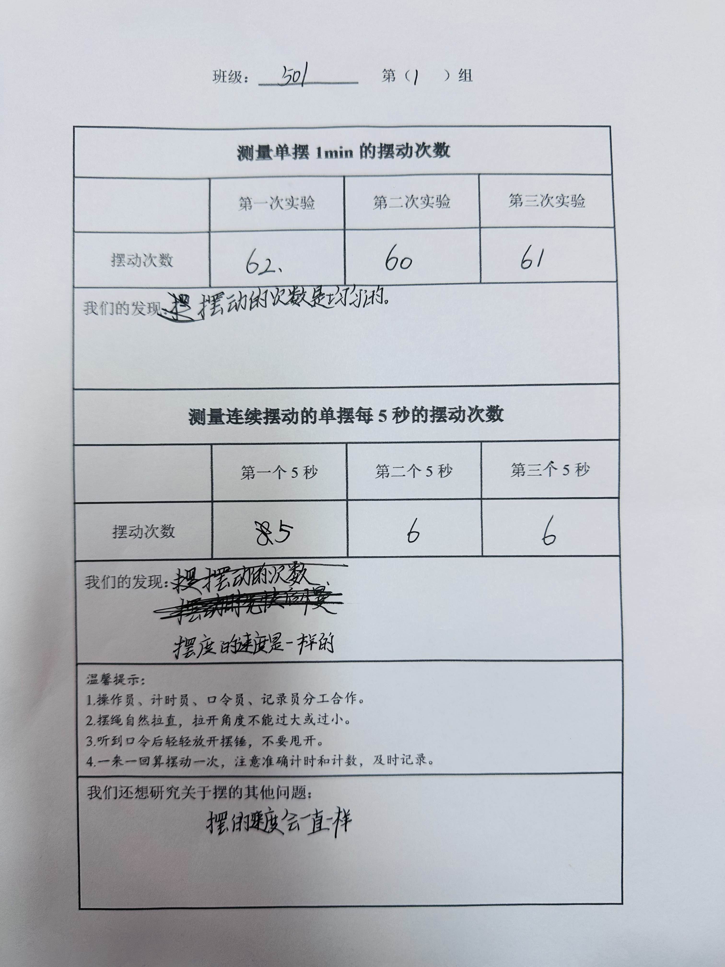(后记4:关于提出新问题,我发现多数小组问题聚焦到“摆的速度会一直保持不变吗?”以及“摆的快慢与什么因素有关?”这两个问题,而这样的问题刚好可以用来开启下节课。同时,其实在活动环节,还有好几个小组直接开展了关于摆的快慢与摆动幅度的关系的研究,通过第一节课就得出了与摆幅无关的结论。)