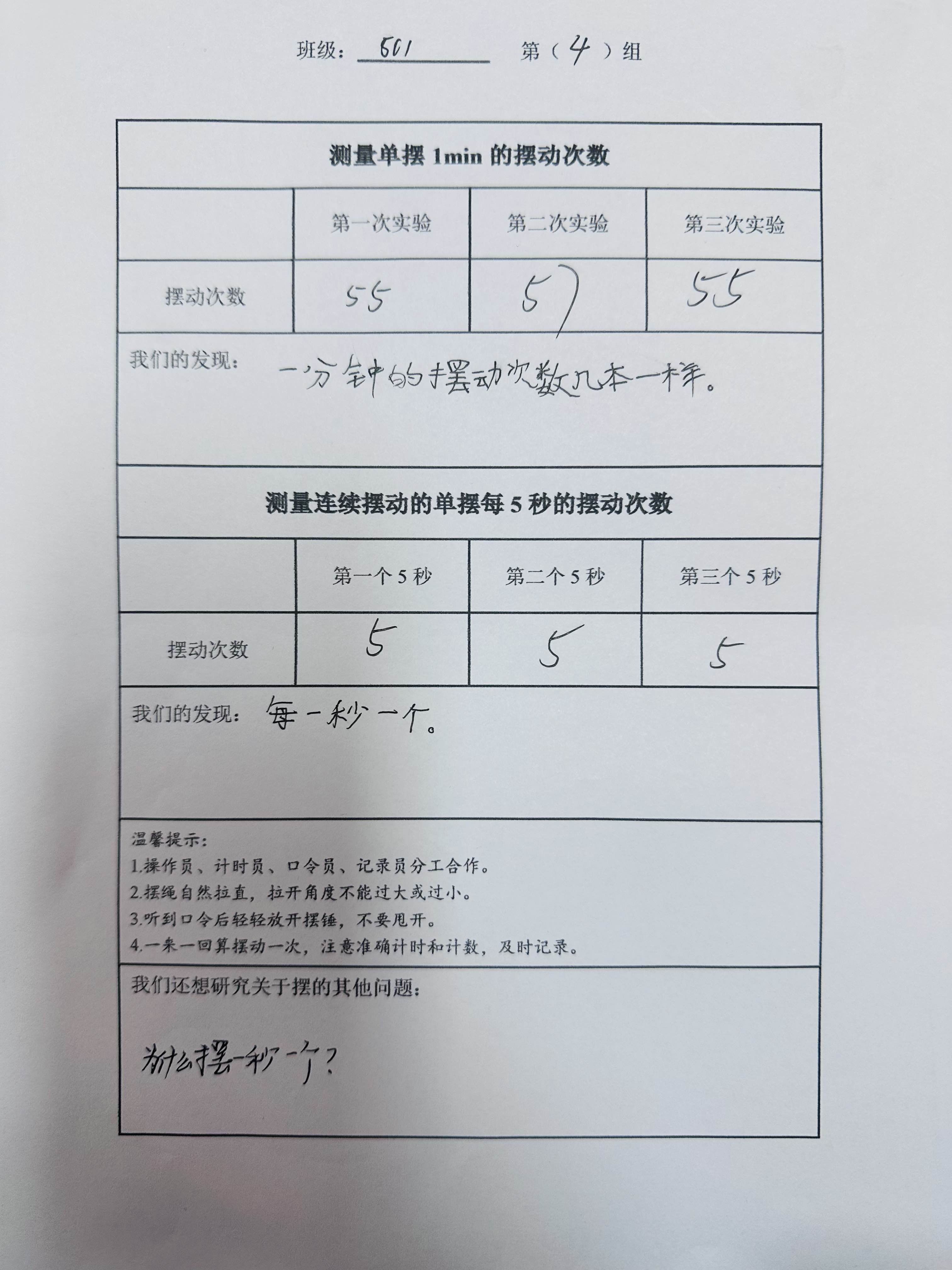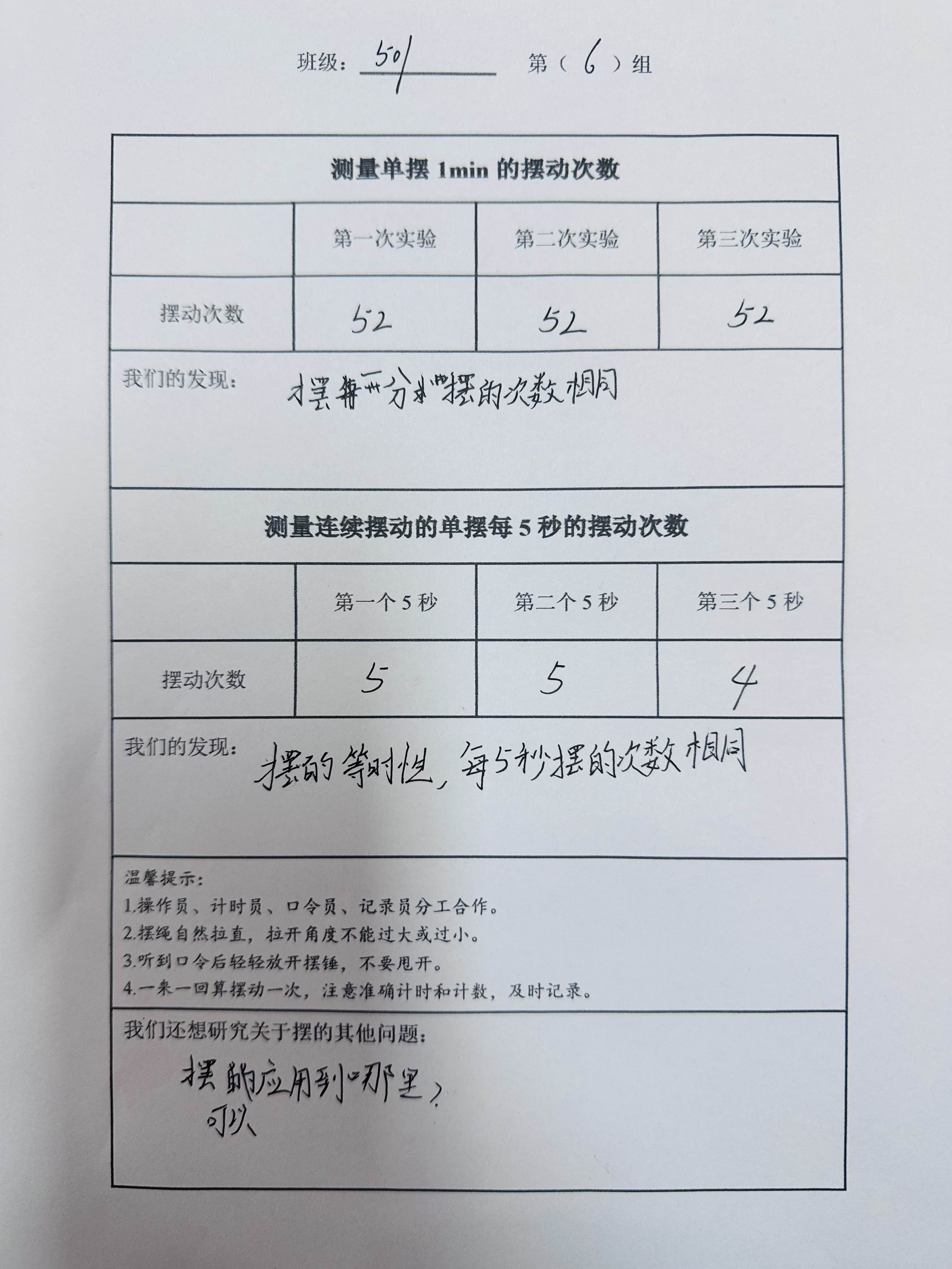 (后记3:课堂上实验的摆,都是随机制作的,摆绳长度不固定,但是在连续测量5秒的摆动次数时,好几个小组都测出来5秒摆动5次。有一个小组在汇报发现时说,他们发现所有的摆平均下来都是1秒摆1次。针对这个结论,其他小组产生了质疑,“如果大家的摆都是一样的1秒摆1次,那1分钟摆动的次数应该都在60次前后,但实际上汇总表里的数据并非如此。”学生能够自主产生质疑并说得有理有据,我想这是这堂课最有价值的地方。在第二个班开展教学的时候,我提前把每个小组的摆长调整了一下,使小组之间差距较大。)
