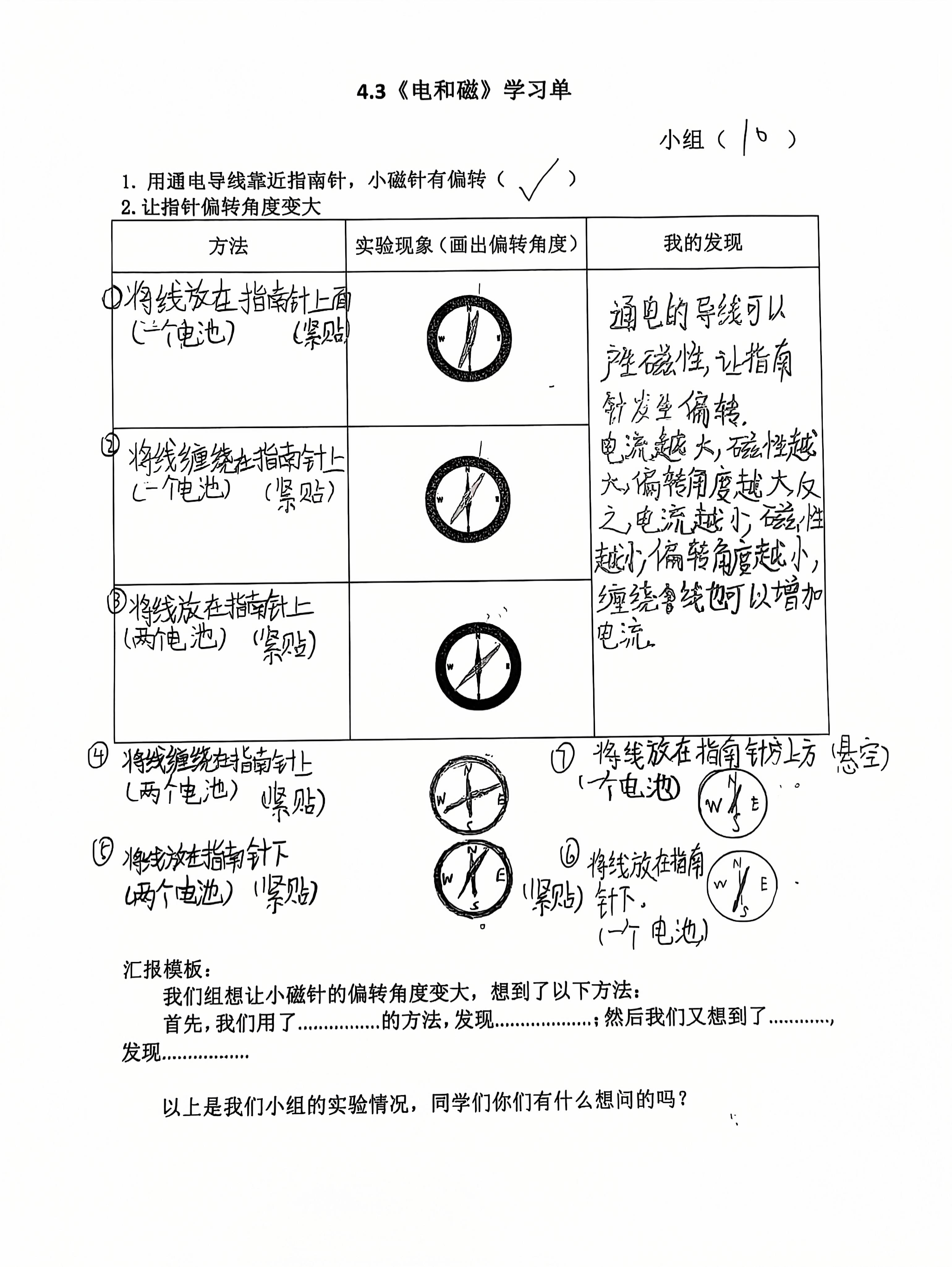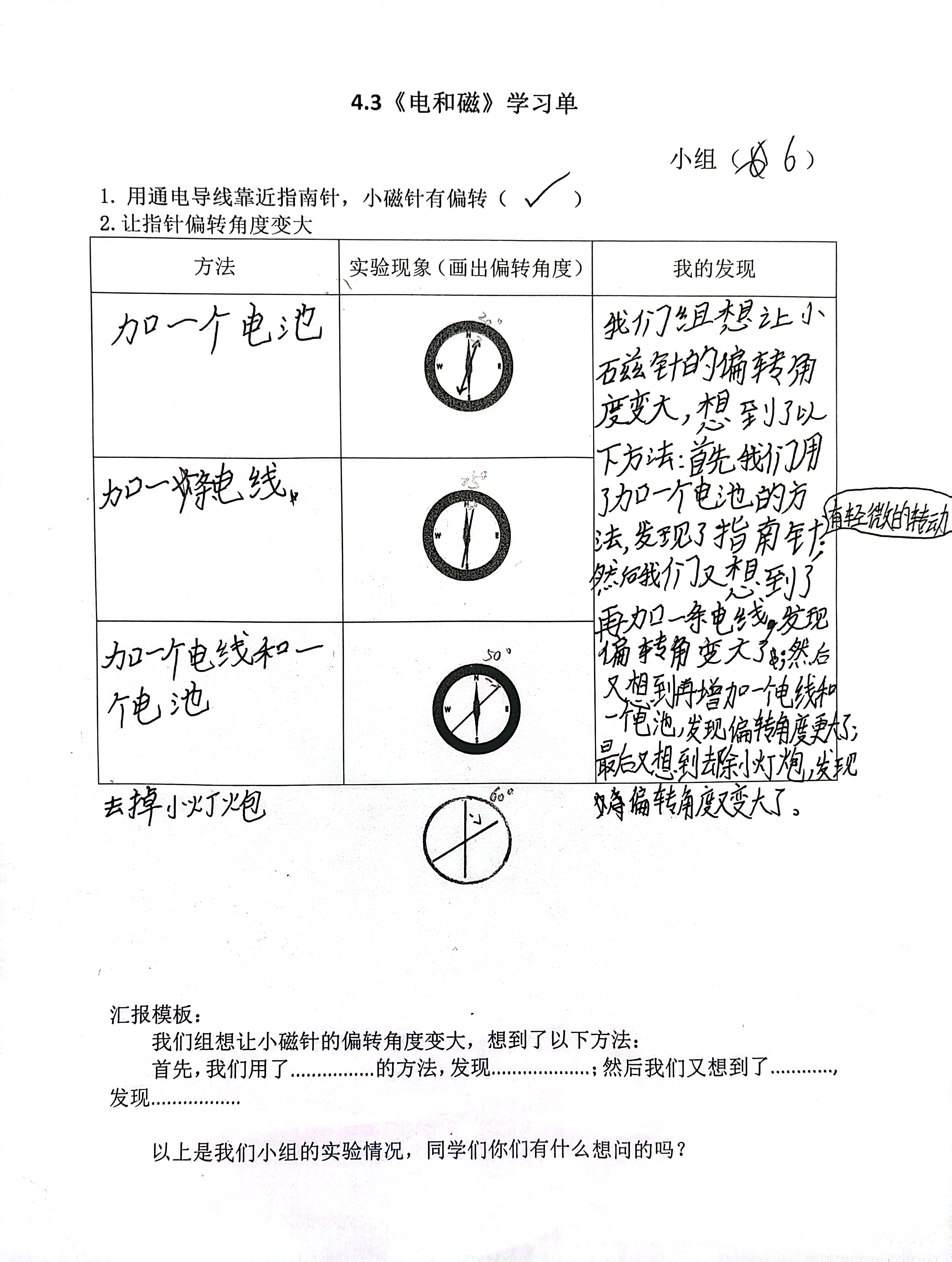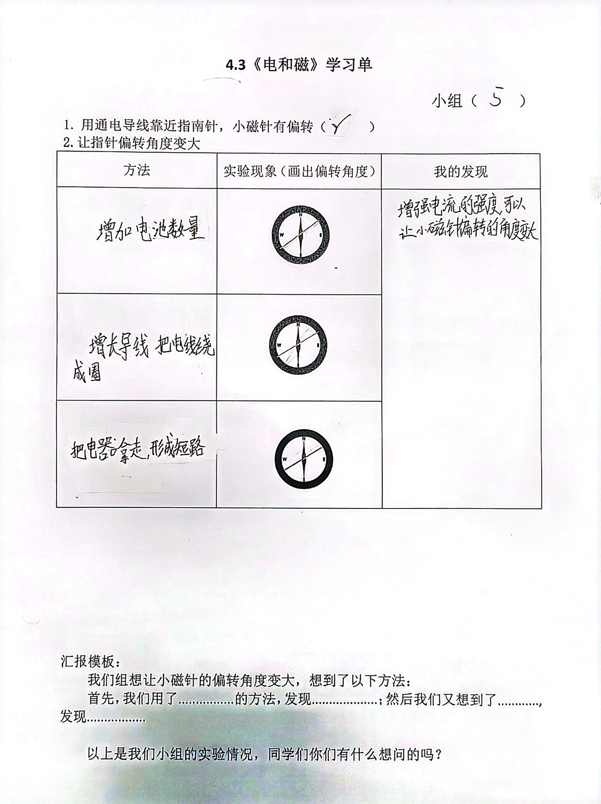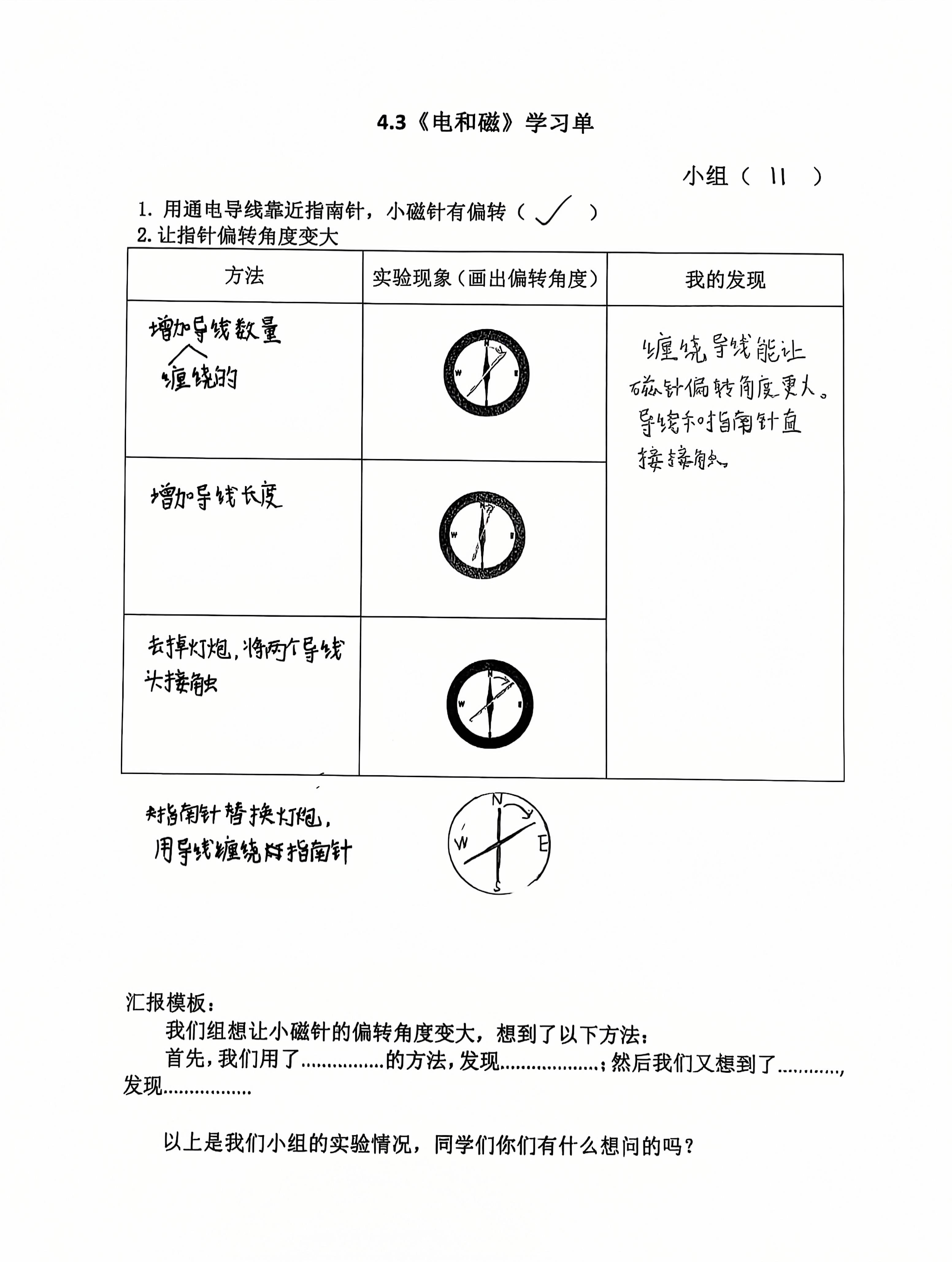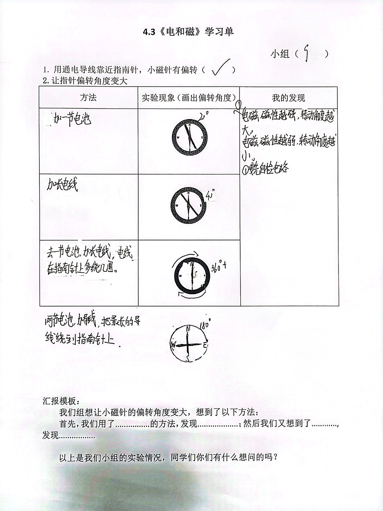 《电和磁》一课根据简约课堂的理念,将教学环节安排如下:一、介绍奥斯特的发现(2分钟);二、学生重演奥斯特实验,并想办法让小磁针偏转角度变大(18分钟);三、学生汇报及总结(20分钟)。给学生充分的探究后,有很多用自己语言表达的发现,记录单令人惊喜,特此分享。