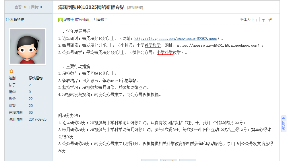 1.论坛研修积分:积极参与小学科学论坛研修活动,认真有效回帖发帖1次积1分,获评1个精华帖积100分;