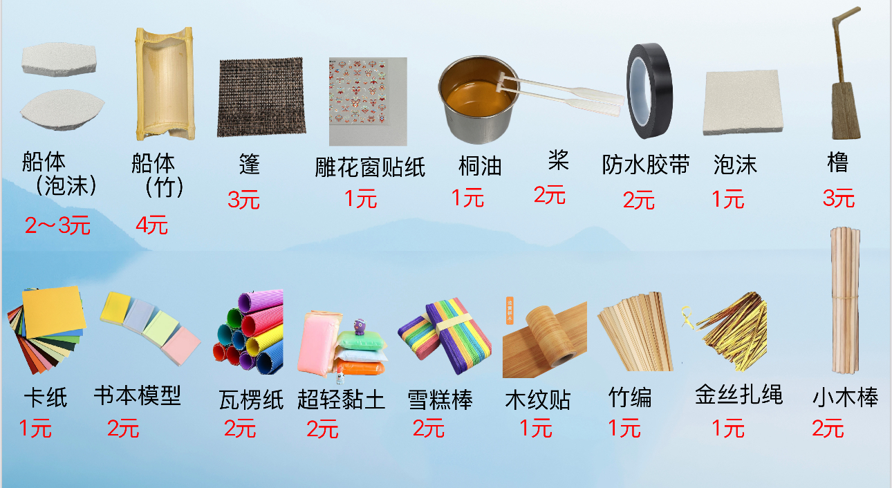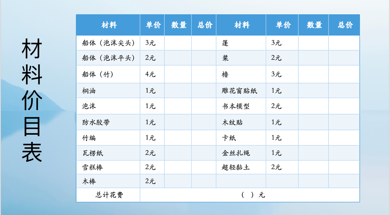 本节课首先需要对书船进行设计。设计前先给孩子们出示本节课需要用到的材料,并且标注了每份材料的价格。每组有20元货币,可以对材料进行多次购买,购买的材料改不退换,所以孩子在设计制作前要思考清楚需要哪些材料,量要多少?