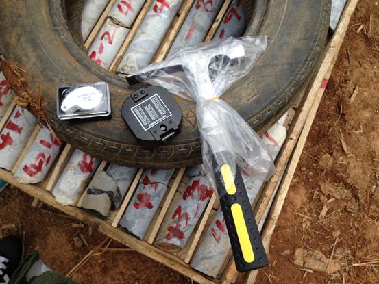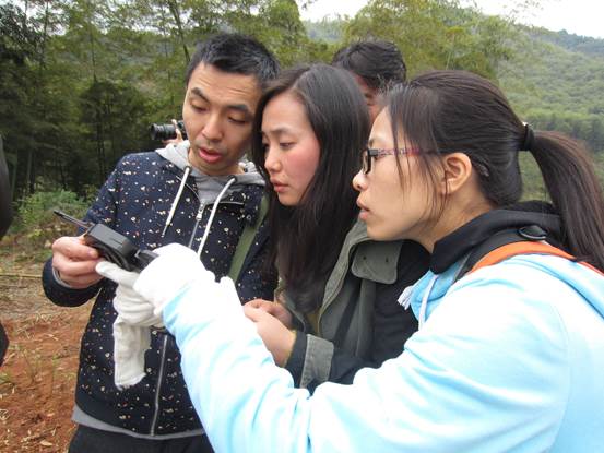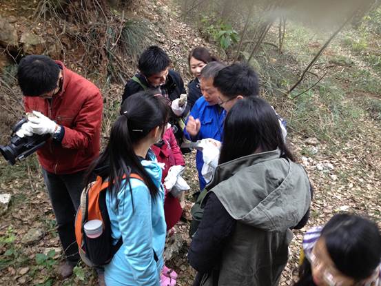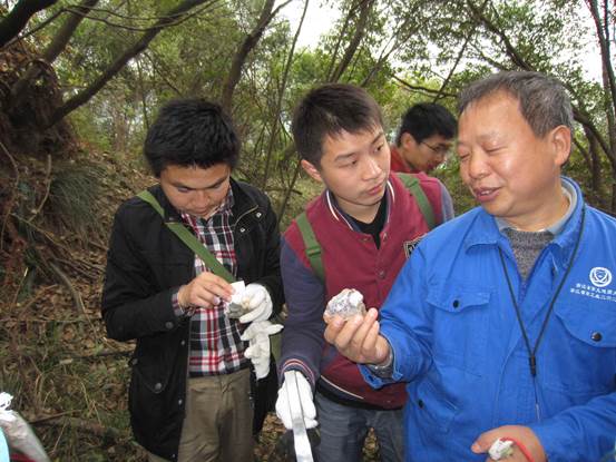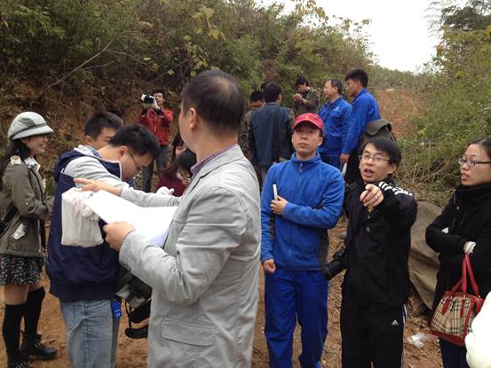 随后,第九地质大队一位经验丰富的老地质工作者向我们介绍了管村附近的矿产(萤石、石英、重晶石等)及形成的原因,指点我们认识和辨别这些矿物。详细指导大家学习了地质锤、罗盘、放大镜的使用。老师们怀着好奇和求知的心情,认真聆听,不时提问。