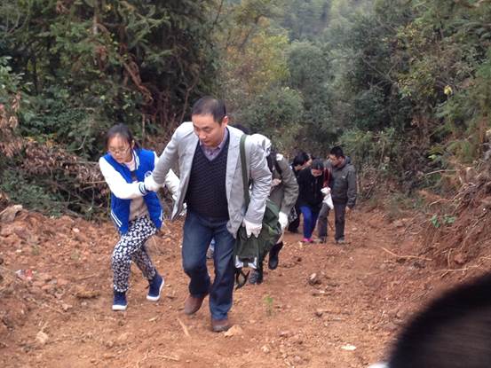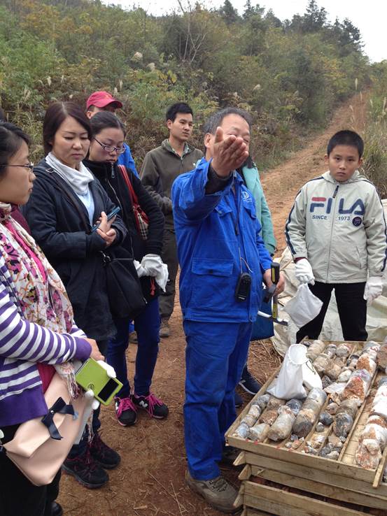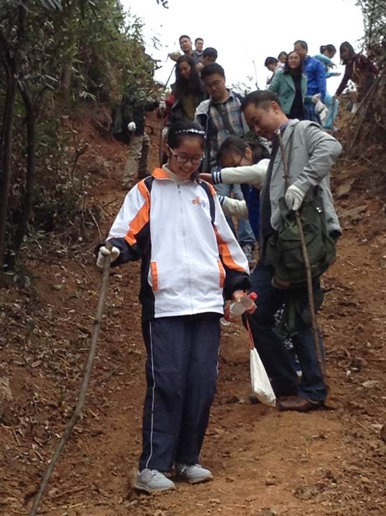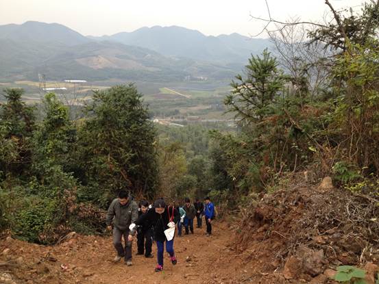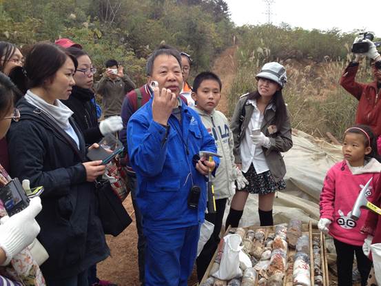 在认真听取了关于矿山和矿物的介绍后,大家开始兴冲冲的向矿山进发,路不太好走,但是没有影响大家的好心情,相互搀扶、共同攀登,沿途还不忘在泥地里翻找一些漂亮的石英和萤石。