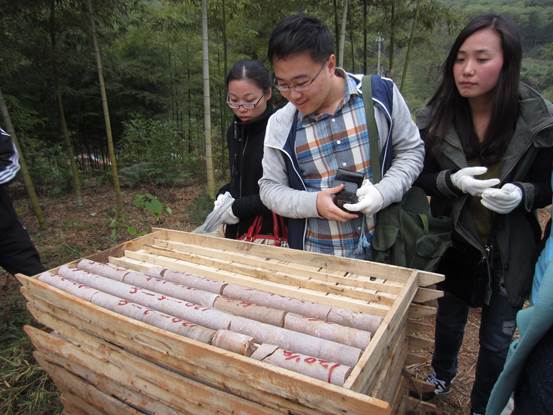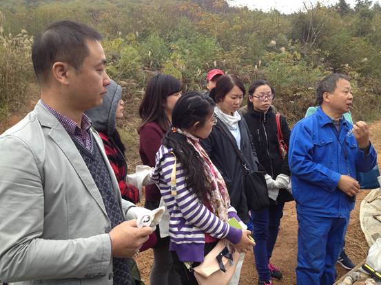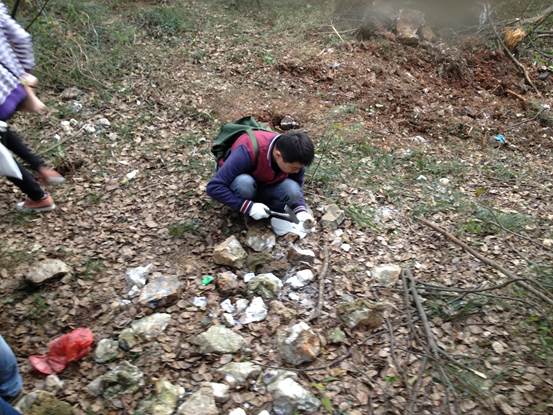 下午1点30分,晴转阴,吴兴区小学科学共同体成员20余人,在浙江省第九地质大队和国土局志愿者的带领下顺利到达埭溪镇管村萤石矿区。在简单的分组后,每组领到一个地质考察工作背包,里面装有地质考察三件宝——地质锤、罗盘、放大镜,以及野外急救包、蛇药等。