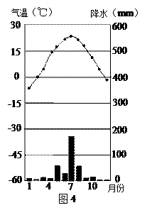 、读图3和图4,并根据所学知识,回答下列问题:图3表示我国某主要地形区中某山自然带的垂直分布,图4是该地形区中某城市年内各月气温和降水量图。
