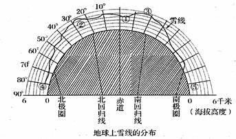 雪线是指多年积雪区和季节积雪区的界线,雪线处的年降雪量等于年消融量。图8是地球上雪线的分布状况图,读图回答下列问题。